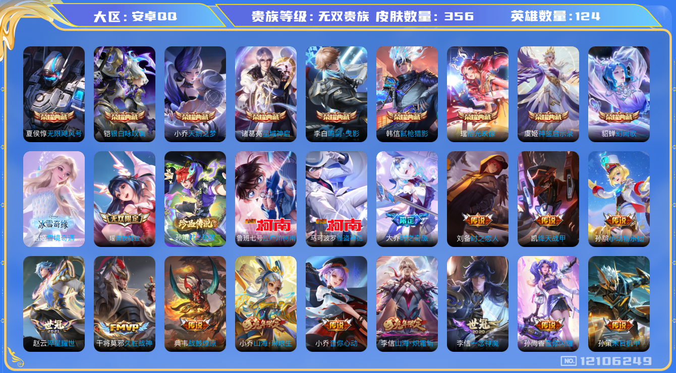 [12106249]无双贵族 9典藏 2无双 3珍品传说 60传说 124英雄 356皮肤 可修改实名 优质装备:天鹅之梦(小乔典藏),无限飓风号(高达),鸣剑·曳影,星域神启(倪克斯贼亮),银白咏叹调(倪克斯侍卫),幻阙歌(貂蝉典藏),弑枪猎影(韩信典藏),真我赫兹(瑶)(瑶无双),神鉴启示录,拾光映像(瑶典藏),雪境奇遇-甄姬,江户川柯南,怪盗基德,黄金狮子座,冠军飞将,云鹰飞将(小将军),绛天战甲(鸡嘴战神),黄金白羊座,猫影幻舞,久胜战神,炽阳神光,一念神魔,云霓雀翎,末日机甲-孙尚香(绿蚂蚱),地狱火,仲夏夜之梦(大飞蛾),音你心动-小乔,海洋之心,地狱之眼,飞鸢探春,音你心动-周瑜,胖达荣荣,乞巧织情,时之恋人-刘备(电焊工),游龙清影(小青龙),淬星耀世,超时空战士-狄仁杰,末日机甲-孙策,花朝如约(花篮子),无双飞将,音你闪耀(rap皮),碎云,天秀幻梦,山海·炽霜斩(李信年限),山海·琳琅生(小乔年限),浮生妄,记忆之芯(机甲兔),电玩·雷克斯,灼幽烈阳,妄想实况,妄想奇谈,惊梅引,鲁班七号-时之奇旅,大乔-时之奇旅,小动物乐团,霜月吟,澜逐花归海,艾琳觅芳踪,牧神诗旅,玄雷天君 珍品传说:时之奇旅-孙策 传说皮:典韦战鼓燎原,云诺千山,星之鸣奏,祥瑞亨通,幻光神枪 限定皮:愿照·福禄聚(蔡文姬年限),愿照·众生和(妲己年限),逐霄战戟,映山客,陌上桑,鸣野蒿,寅虎·展翼(孙膑年限),神威(电光马子),至美·化雀舞,诗剑行,齐天大圣,怒海麟威,降魔,冰锋战神,烈魂 史诗皮:鸭鸭历险记-刘禅,飞车小橘子,苍鳞隐世,器灵·浮梦炉,绮世丹青,谪仙醉月,龙之律动,小牛鸭,石田雨龙,百相守梦-周瑜,茶境仙,幻珠鲛人,怒海争锋,炽弈燎原,撼地雄心,破空之剑,战舞者,夜落电台,奇遇星旅,百相守梦-百里守约,星界特工,百相守梦-黄忠,织梦人,遇见神鹿,紫霞仙子,电玩小子(小书包),白龙吟,黄金分割率,千年之狐,永昼,末日机甲-莱西奥,真我赫兹(镜),真我赫兹(百里守约),浮梦罗烟,完美假期,闲日渔趣,魅语,高渐离燃音魔法,无限星赏官,匿光破解者,冰冠公主,青蛇,偶像歌手,白蛇,晚萤,电玩·兔顽号,电玩·爆裂旋风,暗夜猫娘,银翎春语,龙骑士(小龙虾),末日机甲-吕布,猫狗日记-孙策,猫狗日记-大乔,时之恋人-孙尚香,乱世虎臣,节奏热浪,修罗,女仆咖啡,摇滚巨星,水果甜心,绅士熊喵,