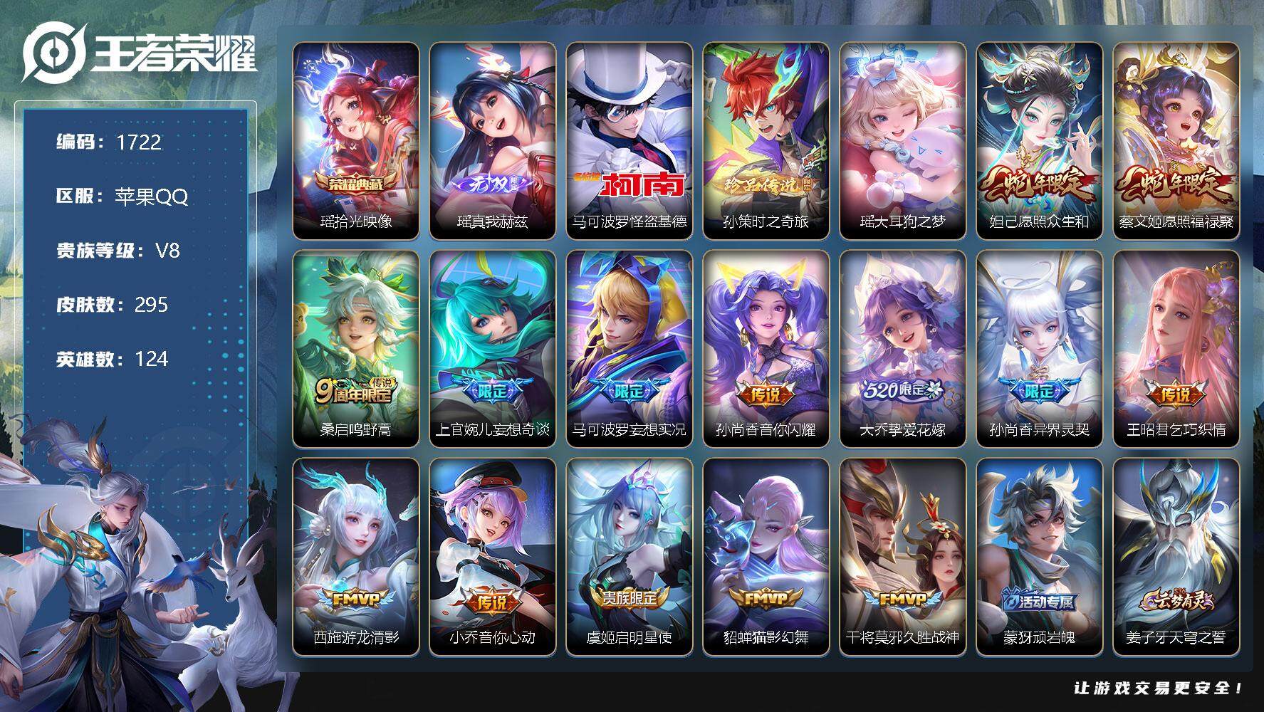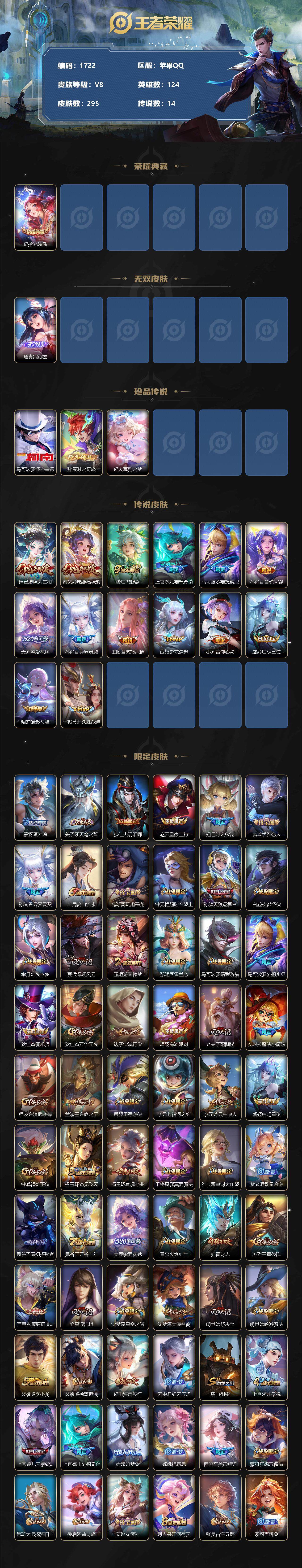 [12106987]【商品标题】:苹果Q-V8-至尊星耀IV段位-124英雄-295皮肤-1典藏-0珍品无双-1无双-3珍品传说-14传说-87史诗
