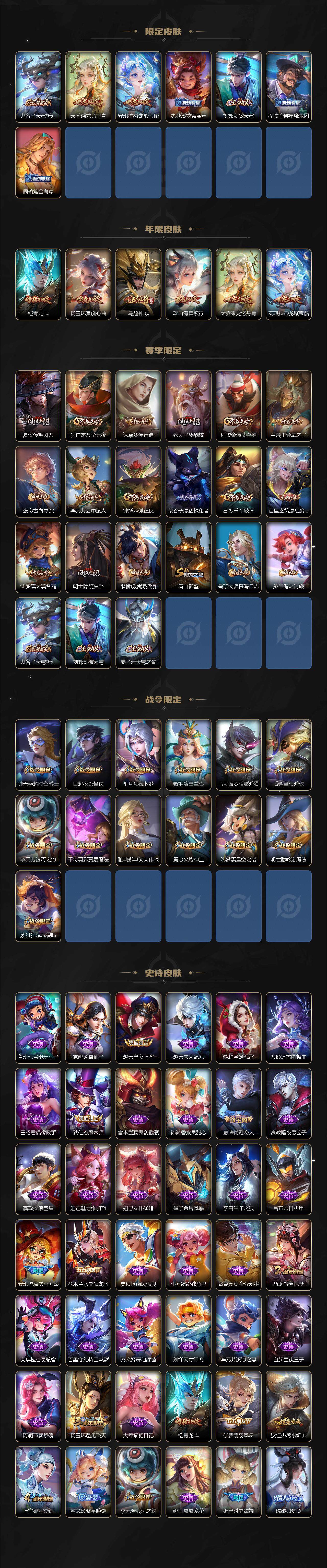 【赛季限定】:夏侯惇朔风刀,狄仁杰万华元夜,达摩沙漠行僧,老夫子醍醐杖,程咬金演武夺筹,兰陵王金庭之子,张良古海寻踪,李元芳云中旅人,钟馗驱傩正仪,鬼谷子原初探秘者,苏烈千军破阵,百里玄策原初追逐者,弈星混沌棋,沈梦溪大漠名商,明世隐疑决卦,裴擒虎擒涛扼浪,盾山御銮,鲁班大师探海日志,桑启海盐诗旅,鬼谷子