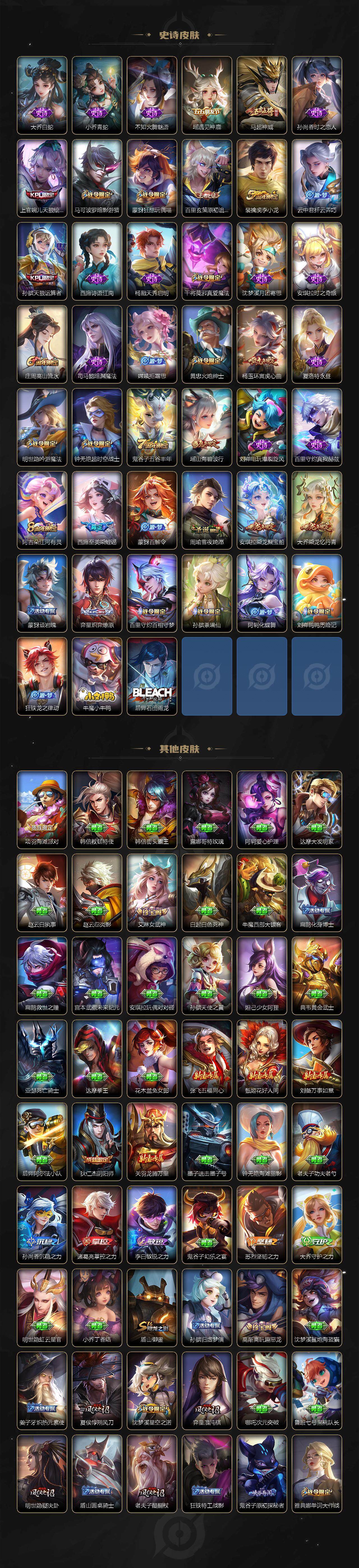 【限定皮肤】:蒙犽顽岩魄,姜子牙天穹之誓,狄仁杰阴阳师,赵云皇家上将,妲己时之彼端,嬴政优雅恋人,孙尚香异界灵契,庄周高山流水,高渐离玩趣恶龙,钟无艳超时空战士,孙膑天狼运算者,白起夜都怪侠,芈月幻夜卜梦,夏侯惇朔风刀,甄姬游园惊梦,甄姬落雪兰心,马可波罗暗影游猎,马可波罗妄想实况,狄仁杰魔术师,狄仁杰万华元夜,达摩沙漠行僧,项羽海滩派对,老夫子醍醐杖,安琪拉魔法小厨娘,程咬金演武夺筹,兰陵王金庭之子,后羿圣弓游侠,李元芳银河之约,李元芳云中旅人,虞姬启明星使,钟馗驱傩正仪,杨玉环遇见飞天,杨玉环寅虎心曲,干将莫邪真爱魔法,雅典娜单词大作战,蔡文姬繁星吟游,鬼谷子原初探秘者,鬼谷子五谷丰年,大乔挚爱花嫁,黄忠火炮绅士,铠青龙志,苏烈千军破阵,百里玄策原初追逐者,弈星混沌棋,沈梦溪星空之诺,沈梦溪大漠名商,明世隐疑决卦,明世隐吟游魔法,裴擒虎李小龙,裴擒虎擒涛扼浪,瑶山海碧波行,云中君纤云弄巧,盾山御銮,上官婉儿梁祝,上官婉儿天狼绘梦者,上官婉儿妄想奇谈,嫦娥如梦令,嫦娥拒霜思,西施至美乘鲤谣,蒙犽狂想玩偶喵,鲁班大师探海日志,桑启海盐诗旅,艾琳女武神,阿古朵江河有灵,张良古海寻踪,蒙犽百解令,鬼谷子天穹祈灯,大乔乘龙忆丹青,安琪拉乘龙聚宝船,沈梦溪龙舞盛年,刘邦剑破天穹,程咬金群星魔术团,周瑜熔金海岸