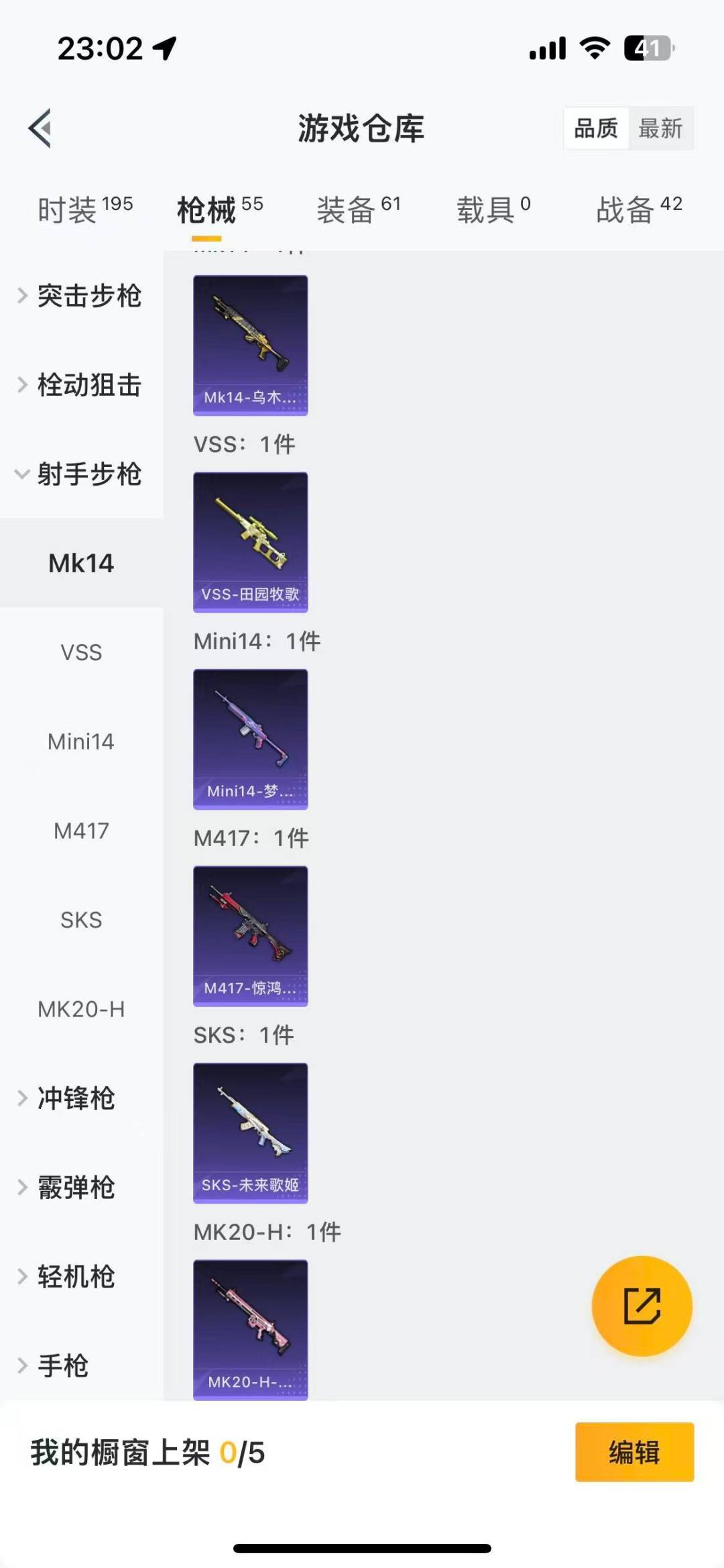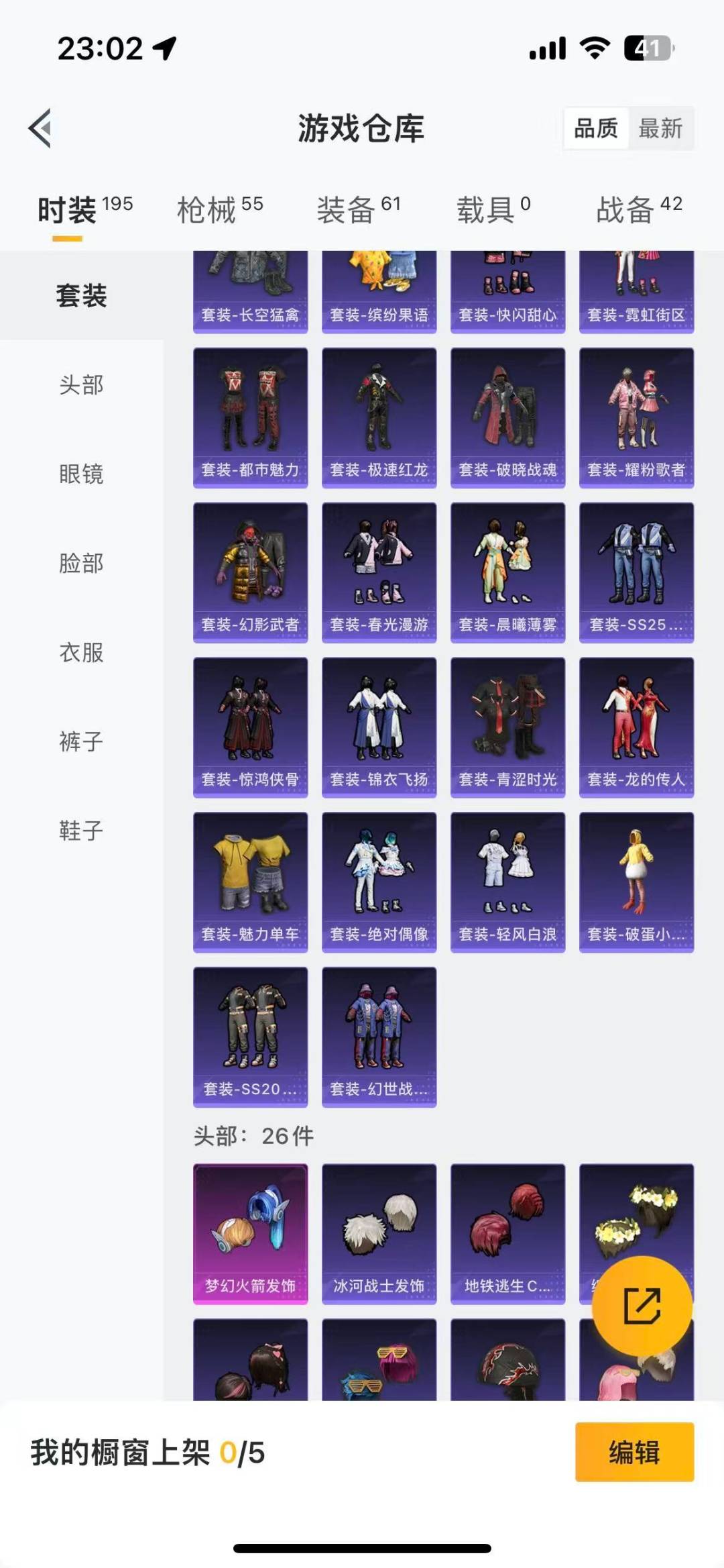 - [12140668]27粉装 14特效枪 3载具 13印记 可二次 可修改实名 身法装备:舞王派对(派对舞王、小金鞋),萌熊伴侣背包(粉熊背包) 优质装备:星梦玉骢,晶梦灵驹,舞王派对(派对舞王、小金鞋),萌熊伴侣背包(粉熊背包),AKM炫紫旋律,梦幻火箭(新101)(新火箭少女101粉色套装),宝贝奶油派,天使彩虹糖,缤纷油彩(猪妹猪脸妹),炙焰红王,冰霜白皇,童趣迷兔,星空之魅,馨动时刻,SCAR-L纯梦嫁纱,M417第五大道,M416超新星,AKM绿萝繁花,SCAR-L-锦绣绵绵,SPAS-12蜜语绒猫,千金淑猫,AUG-暖羊咩咩,破片手榴弹-热量炸弹,MK12-雪月幻音,星穹咏叹调,烟雾弹-甜梦果泡,荧海星豚,蜜獾-荧海星豚,奇迹舞步-美雪,羊梦糖心,Kar98K-巳巳如意 热门装扮:甜梦小狐,寒光使者,彩虹甜喵,冰川红玫,冰川幽秘,挚爱序曲,第五大道,水仙星,闲梦青缨,憨憨奶龙,蜜语绒猫,烟云彩露,美雪,兔兔白日梦,奶芙汪汪,派对舞王(小金鞋) 载具:双人摩托-梦幻火箭 稀有枪皮:DP-28-豹影疾电 六级特效枪:六级破片手榴弹-热量炸弹,六级M416-超新星 五级特效枪:五级Kar98K-伏魔团,五级Kar98K-巳巳如意,五级DP-28-豹影疾电,五级AUG-暖羊咩咩,五级M417-第五大道,五级SCAR-L-纯梦嫁纱,五级SCAR-L-锦绣绵绵,五级AKM-绿萝繁花 四级特效枪:四级蜜獾-荧海星豚,四级烟雾弹-甜梦果泡,四级SPAS-12-蜜语绒猫 二级特效枪:二级MK12-雪月幻音 紫色装扮:幻彩翩翩,SS23特训,妙红点点,霓虹热舞,SS30特训套装,SS31特训套装,云朵鹅,彩虹兔,雪绒豹,SS33特训套装,青涩时光,旭日情侣,田园牧歌,轻风白浪,和煦暖阳,SS22特训,莱茵河畔,香榭午后,龙舌兰冰茶,顶瓜瓜,双彩绵绵,完美偶像,帅气教官,浓情摩卡,俏皮奶喵,暖心橘喵,魔力冰咖,雪兔飞飞,黄色名流,飞行日记,魅力单车,黄色运动,黎明保卫者,龙的传人,龟仙人,冰河战士,龙魂突击队,蝶变,香桃花海,霓虹街区,超能勇士,软软小魔女,软软马卡龙,都市漫游者,酷萌兔限定,长空猛禽,黯羽织刑,蜜露汐语,蓝海鲸歌,涂山之恋,牛气满满,海岛探路者,沙漠兵团,糯粉咩咩,绮丽涂鸦,缤纷果语,蓝色运动,空岛之星,萝兰蝴蝶,SS29特训,小熊娃娃,星途旅人,雏菊兔兔,奶油梦幻熊,热情海星
