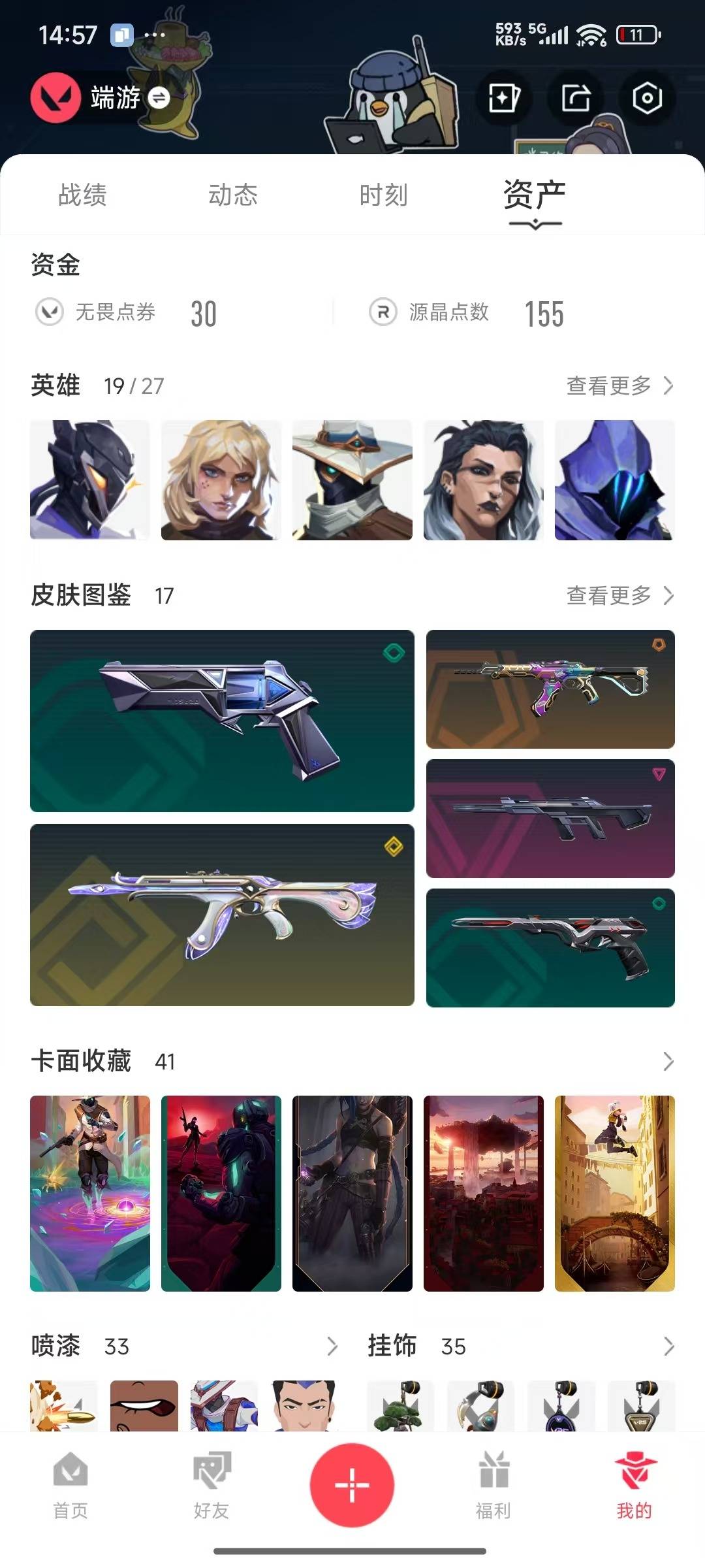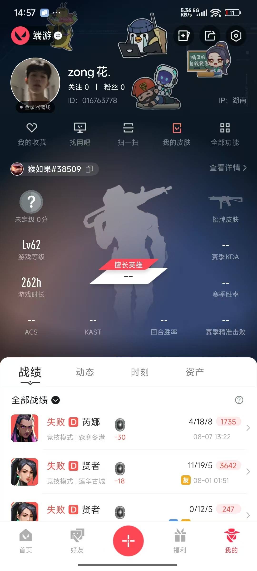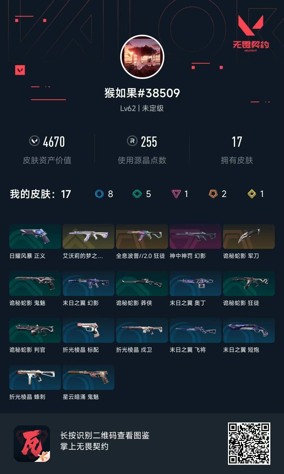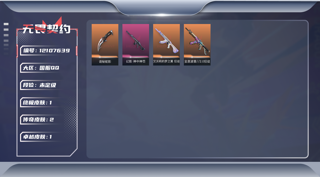 [12107639]2橙皮 1金皮 1紫皮 17皮肤 19英雄 41卡面 255已用源晶 未定级 优质装备:狂徒-艾沃莉的梦之翼,狂徒-全息波普//2.0,诡秘蛇影 步枪皮肤:幻影-神中神罚