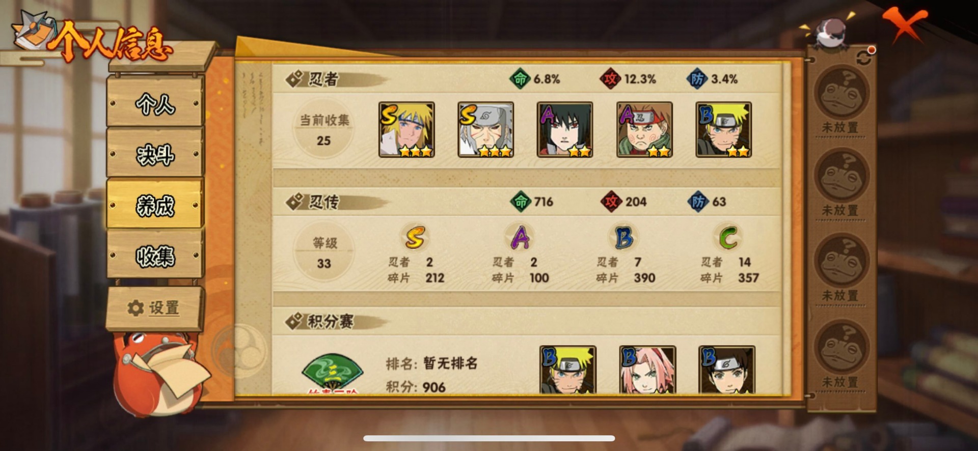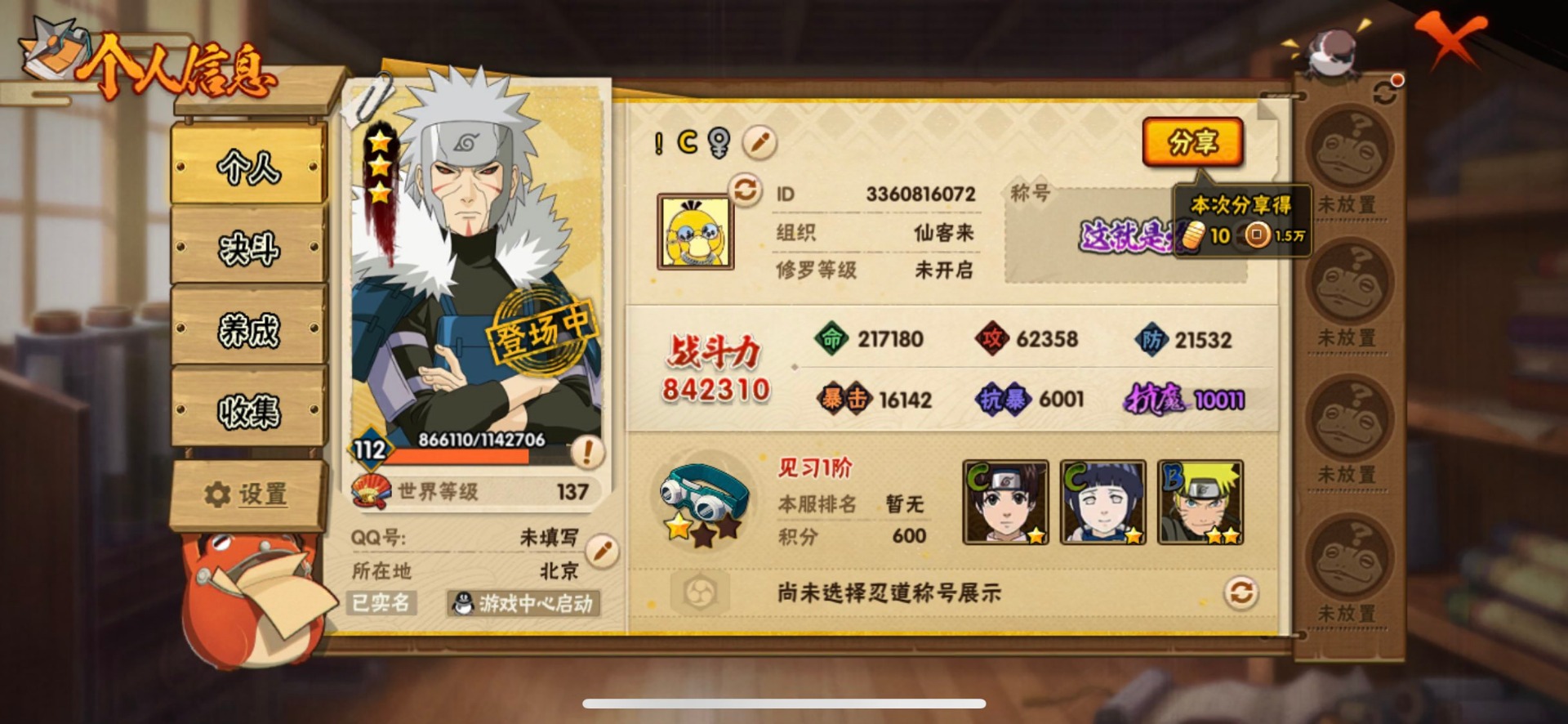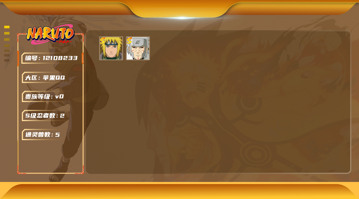 [12108233]v0 2S忍 2A忍 5通灵 84.2W战力 可二次 可修改实名 优质装备:千手扉间「秽土转生」 S级忍者:波风水门