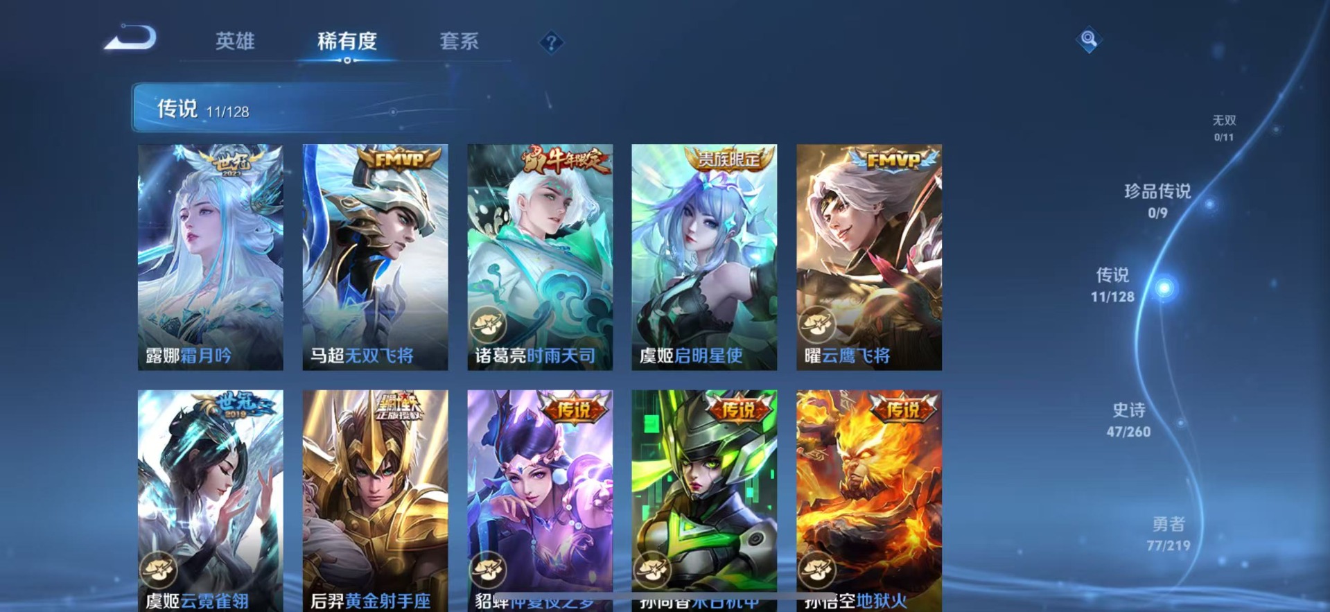 - [12131381]V8 1典藏 15传说 122英雄 229皮肤 可修改实名 优质装备:鸣剑·曳影,冠军飞将,一念神魔,末日机甲-孙尚香(绿蚂蚱),地狱之眼,音你心动-周瑜,李逍遥,淬星耀世,浮生妄 珍宝阁皮:妄想食味,蔷薇恋人,玩趣恶龙 限定皮:逐霄战戟,鸣野蒿,至尊宝,白虎志(电光耗子),傲雪梅枪,绯月行,神威(电光马子),高山流水,诗剑行,怒海麟威,五谷丰年,青龙志(铠年限),冰锋战神,梁祝,天狼狩猎者,李小龙,逐梦之影,永曜之星,猪悟能,大圣娶亲,青春决赛季 史诗皮:石田雨龙,苍穹之光,电玩小子(小书包),特工魅影,江河有灵,真我赫兹(百里守约),魅语,蒙恬荣光圣徽,偶像歌手,电玩·爆裂旋风,暗夜猫娘,末日机甲-吕布,猫狗日记-孙策,乱世虎臣,节奏热浪,修罗,水果甜心,绅士熊喵,天才门将,星夜王子,时之奇旅-安琪拉,功夫厨神,德古拉伯爵,暗隐猎兽者,幽灵船长,鬼剑武藏,暗渊魔法,心灵战警,舞动绿茵,繁星吟游(呼啦呼啦),拒霜思,缤纷独角兽,乘风破浪,逐浪之夏,水晶猎龙者,曙光守护者,金属风暴,原初追逐者,圣诞恋歌,鹰眼统帅,王者之锤,魅力维加斯,黎明之约,赏金猎手,无心