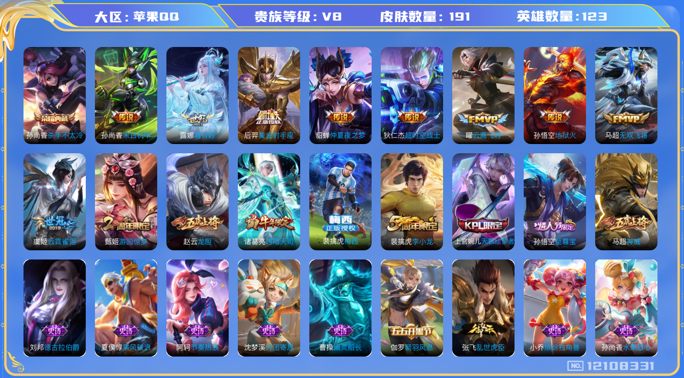 [12108331]V8 1典藏 11传说 123英雄 191皮肤 可修改实名 优质装备:杀手不太冷,黄金射手座,云鹰飞将(小将军),云霓雀翎,末日机甲-孙尚香(绿蚂蚱),地狱火,仲夏夜之梦(大飞蛾),超时空战士-狄仁杰,无双飞将,霜月吟 限定皮:至尊宝,梅西,时雨天司(水龙头),神威(电光马子),游园惊梦,龙胆,天狼绘梦者,李小龙 史诗皮:百相守梦-百里守约,紫霞仙子,白龙吟,黄金分割率,特工魅影,千年之狐,魅语,百解令(蒙犽),无限星赏官,冰冠公主,龙骑士(小龙虾),末日机甲-吕布,乱世虎臣,节奏热浪,修罗,摇滚巨星,水果甜心,德古拉伯爵,暗隐猎兽者,幽灵船长,鬼剑武藏,心灵战警,繁星吟游(呼啦呼啦),缤纷独角兽,乘风破浪,逐浪之夏,月团寄思,水晶猎龙者,箭羽风息,金属风暴,圣诞狂欢,圣诞恋歌,鹰眼统帅,魅力维加斯