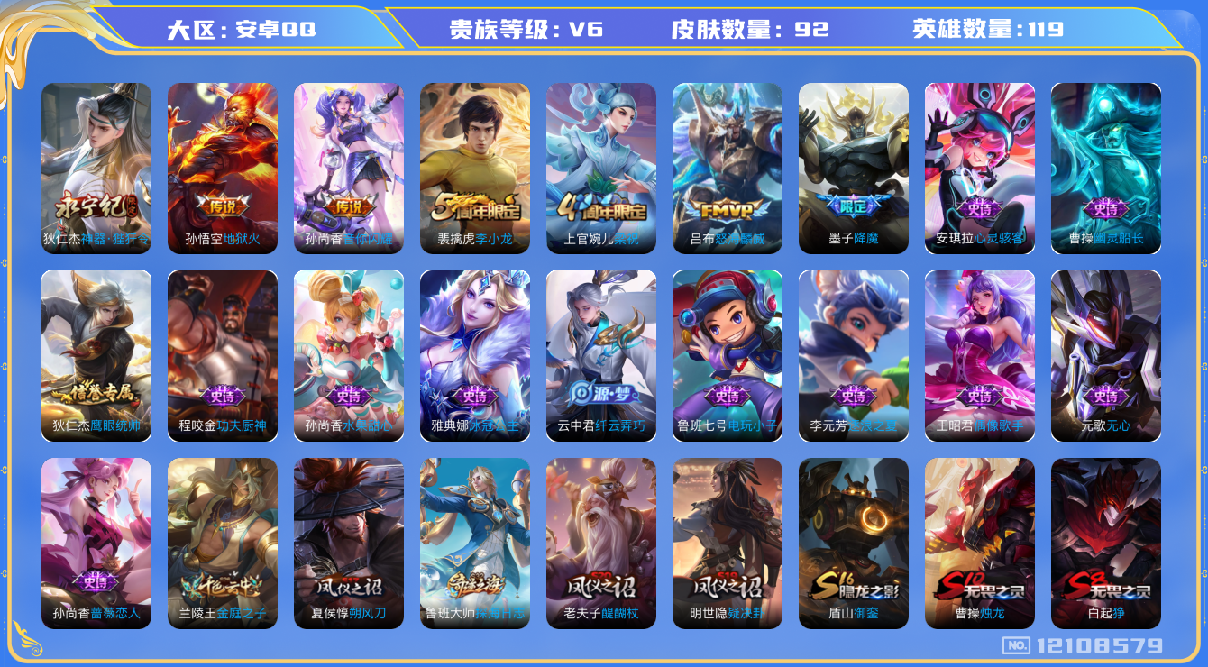 [12108579]V6 4传说 119英雄 92皮肤 可修改实名 优质装备:地狱火,音你闪耀(rap皮),神器·狴犴令 珍宝阁皮:蔷薇恋人 限定皮:怒海麟威,降魔,梁祝,李小龙 史诗皮:电玩小子(小书包),冰冠公主,偶像歌手,水果甜心,心灵骇客,功夫厨神,幽灵船长,纤云弄巧,逐浪之夏,鹰眼统帅,无心