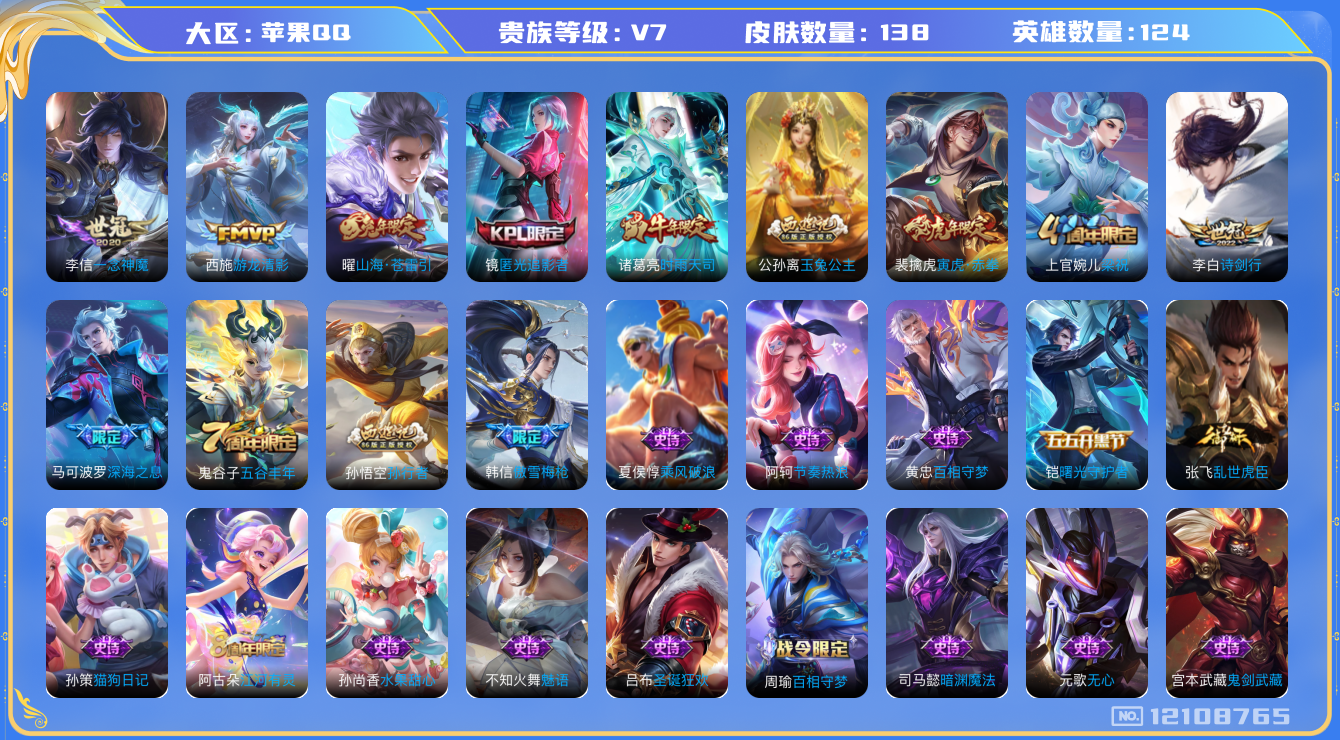 - [12148412]V10 3典藏 6无双 6珍品传说 48传说 125英雄 451皮肤 可修改实名 优质装备:全息碎影(猴子典藏),弑枪猎影(韩信典藏),真我赫兹(瑶)(瑶无双),碎月剑心(李白无双),小乔时之魔女(小乔无双),花合斗,雪境奇遇-甄姬,器灵·螭龙剑,最初的交响(伽罗典藏),器灵·落星盏,酷洛米之心,大耳狗之梦,朽木白哉,黄金狮子座,云鹰飞将(小将军),绛天战甲(鸡嘴战神),黄金白羊座,猫影幻舞,久胜战神,炽阳神光,一念神魔,末日机甲-孙尚香(绿蚂蚱),地狱火,仲夏夜之梦(大飞蛾),零号·赤焰,地狱之眼,胖达荣荣,游龙清影(小青龙),末日机甲-孙策,音你闪耀(rap皮),碎云,山海·炽霜斩(李信年限),浮生妄,记忆之芯(机甲兔),百相守梦(张飞),夜礼服假面,霜月吟,澜逐花归海,艾琳觅芳踪,千劫归真,涂山容容 珍品传说:时之奇旅-孙策,兔狲·蓬尾 传说皮:典韦战鼓燎原,云诺千山,续相思,星之鸣奏,祥瑞亨通,幻光神枪 珍宝阁皮:妄想食味,胡桃夹子,蔷薇恋人 限定皮:愿照·九州拓(澜年限),愿照·福禄聚(蔡文姬年限),愿照·岁时盈(虞姬年限),愿照·山河定(司空震年限),愿照·众生和(妲己年限),愿照·千秋盛(女娲年限),逐霄战戟,鸣野蒿,至尊宝,白虎志(电光耗子),绯月行,时雨天司(水龙头),神威(电光马子),飞衡(韩信年限),山海·碧波行(瑶年限),至美·乘鲤谣,齐天大圣,怒海麟威,五谷丰年,冰锋战神,游园惊梦,虎魄,祈雪灵祝(雪兔子),李小龙,如梦令-后羿,默契交锋-兰陵王,孙行者,猪悟能,大圣娶亲,引擎之心,蜜橘之夏,美猴王,百木心枪,玉兔公主,山海·玄木吟(马可年限),冰霜神祇 史诗皮:鸭鸭历险记-刘禅,飞车小橘子,苍鳞隐世,器灵·浮梦炉,糖绘人间,狼魂孤将,瑰影绮梦,化蝶舞,灵蛊蚀心,星界战将,龙之律动,雪豹·霜爪,藏狐·褐绒,布丁狗之誓,小牛鸭,石田雨龙,百相守梦-周瑜,茶境仙,怒海争锋,破空之剑,战舞者,琥珀纪元伽罗,蔬乡物语(鲁班七号),百相守梦-百里守约,百相守梦-黄忠,织梦人,紫霞仙子,苍穹之光,电玩小子(小书包),黄金分割率,特工魅影,千年之狐,江河有灵,匿光侦查者,浮梦罗烟,完美假期,魅语,百解令(蒙犽),高渐离燃音魔法,蒙恬荣光圣徽,无限星赏官,匿光破解者,冰冠公主,青蛇,偶像歌手,白蛇,晚萤,暗夜猫娘,龙骑士(小龙虾),末日机甲-吕布,猫狗