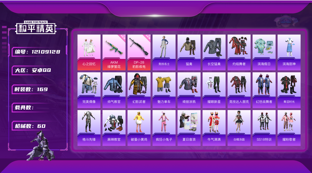 [12109128]1粉装 2特效枪 3印记 可二次 可修改实名 优质装备:AKM绿萝繁花 热门装扮:心之回忆 稀有枪皮:DP-28-豹影疾电 五级特效枪:五级DP-28-豹影疾电,五级AKM-绿萝繁花 紫色装扮:SS23特训,娇憨猪猪,萌趣咩咩,SS21特训,青涩时光,SS20特训,SS19特训,竞技角斗士,吉莉礼服,SS18特训,长空猛禽,耀眼新星,魅力单车,麻辣教官,柠萌假日,格斗先锋,深蓝色名流,滨海假日,幻影武者,夏日音浪,完美偶像,帅气教官,幻世战舞者,滨海厨神,绮丽涂鸦,疯狂小兔子,破蛋小黄鸡,福星高照,空投萌叽,竞技达人朋克,灼焰舞者,牛气满满,猛禽,玉兔迎春,竞技名士,惊鸿侠骨,SS24特训(SS24特训套装),SS25特训,锦衣飞扬,牛仔情诗,SS26特训,星影赞美诗,耀粉歌者,白糯汤圆 优质战备:太空嘟嘟降落伞,童趣迷兔降落伞