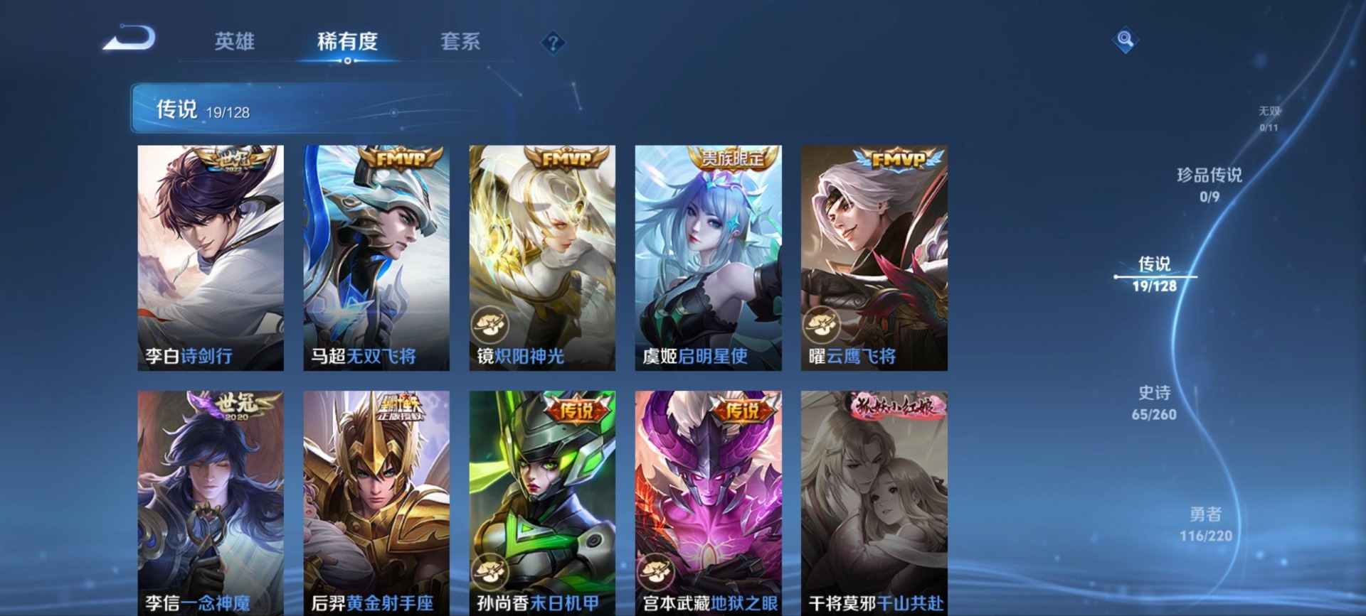 - [12148606]V10 7典藏 1无双 35传说 126英雄 334皮肤 典藏英雄武则天 可修改实名 优质装备:倪克斯神谕(宇宙婆娘),无限飓风号(高达),杀手不太冷,大秦宣太后,鸣剑·曳影,全息碎影(猴子典藏),九霄神辉(木兰典藏),器灵·螭龙剑,黄金射手座,冠军飞将,云鹰飞将(小将军),黄金白羊座,猫影幻舞,久胜战神,炽阳神光,一念神魔,云霓雀翎,末日机甲-孙尚香(绿蚂蚱),仲夏夜之梦(大飞蛾),海洋之心,李逍遥,时之恋人-刘备(电焊工),游龙清影(小青龙),超时空战士-狄仁杰,山海·苍雷引(电光曜子),艾琳觅芳踪 传说皮:云诺千山,星之鸣奏 珍宝阁皮:蔷薇恋人,女武神 限定皮:愿照·千秋盛(女娲年限),至尊宝,白虎志(电光耗子),凤求凰(白切鸡),太华(伽罗年限),寅虎·展翼(孙膑年限),前尘镜,绯月行,时之彼端,白晶晶,时雨天司(水龙头),神威(电光马子),飞衡(韩信年限),玄嵩(庄周年限),怒海麟威,五谷丰年,冰锋战神,幽恒(沐浴露),武圣,天狼运算者,御风骁将(吕布年限),天狼狩猎者,龙胆,逐梦之星,烈魂,岱宗(典韦年限),天狼溯光者,虎魄,奔雷神使(牛魔年限),祈雪灵祝(雪兔子),天狼绘梦者,李小龙,逐梦之影,逐梦之光,如梦令-后羿,霸王别姬-项羽,霸王别姬-虞姬,奇迹圣诞,默契交锋-兰陵王,默契交锋-花木兰,一生所爱,大圣娶亲,天魔缭乱,青春决赛季,冰霜恋舞曲,云端筑梦师,蜜橘之夏,神奇女侠,匿光追影者,寅虎·御盾(廉颇年限),寅虎·瑞焰(虎皮蛋子),寅虎·心曲(虎婆),寅虎·赤拳(老虎年限),时之祈愿-云中君,玉兔公主,山海·玄木吟(马可年限) 史诗皮:化蝶舞,紫霞仙子,苍穹之光,电玩小子(小书包),白龙吟,特工魅影,千年之狐,永昼,魅语,蒙恬荣光圣徽,无限星赏官,冰冠公主,偶像歌手,晚萤,暗夜猫娘,末日机甲-吕布,猫狗日记-孙策,时之恋人-孙尚香,乱世虎臣,节奏热浪,修罗,水果甜心,绅士熊喵,天才门将,星夜王子,心灵骇客,功夫厨神,德古拉伯爵,暗隐猎兽者,幽灵船长,鬼剑武藏,心灵战警,舞动绿茵,地狱岩魂,纤云弄巧,繁星吟游(呼啦呼啦),拒霜思,缤纷独角兽,乘风破浪,逐浪之夏,水晶猎龙者,曙光守护者,箭羽风息,金属风暴,原初追逐者,圣诞狂欢,圣诞恋歌,鹰眼统帅,暗夜贵公子,魅力维加斯,黎明之约,寅虎·御盾