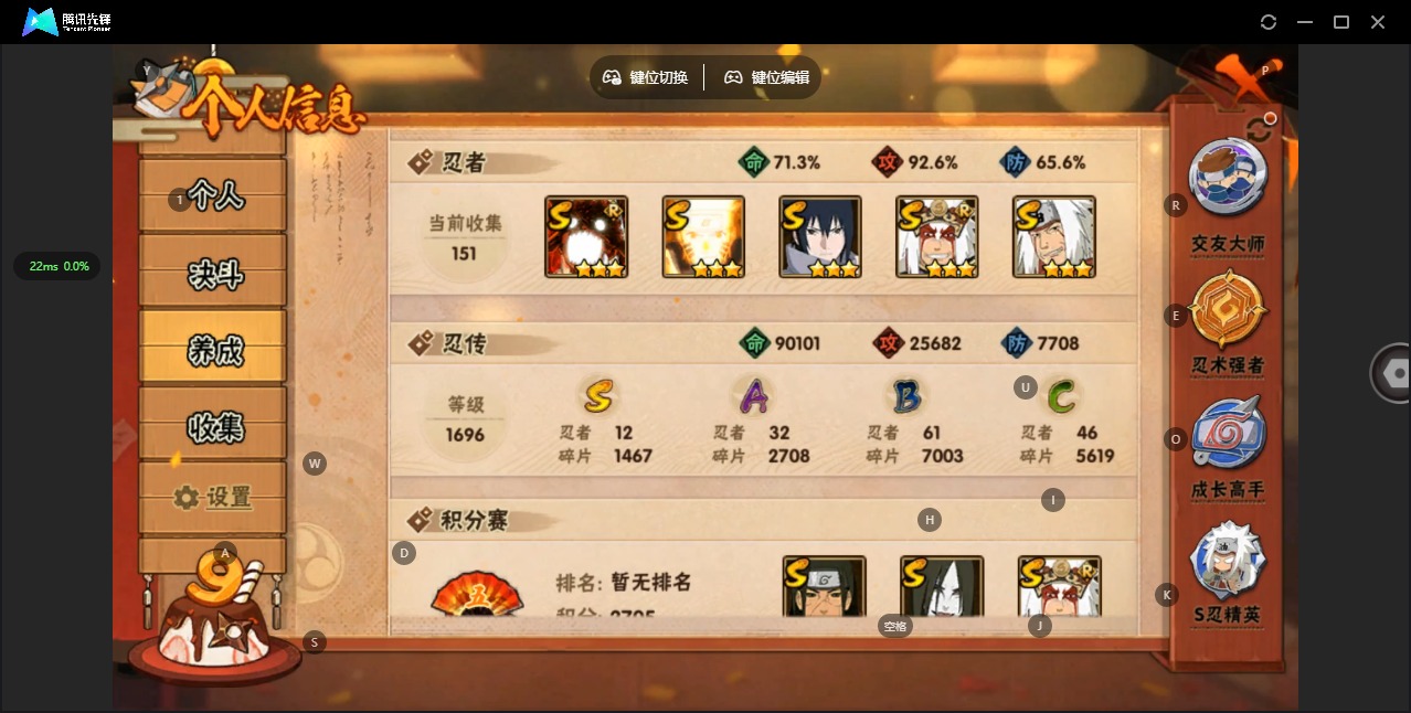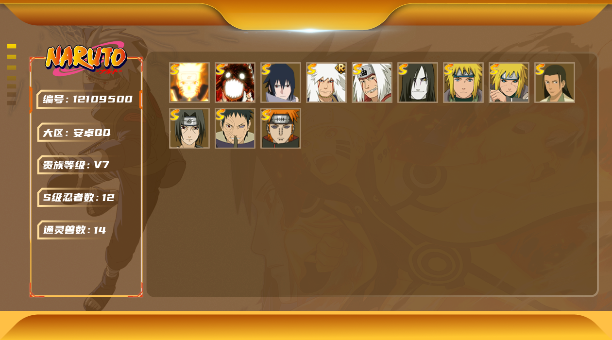 [12109500]V7 12S忍 32A忍 14通灵 641.8W战力 可二次 可修改实名 优质装备:波风水门「秽土转生」,宇智波带土 「忍界大战」,漩涡鸣人 「九喇嘛连结」,宇智波佐助「永恒万花筒」,千手柱间·木叶创立,自来也 「传说中的三忍」,漩涡鸣人 「暴怒·第六尾」 S级忍者:自来也 「舞之豪杰」,宇智波鼬 「须佐能乎」,佩恩「天道」,波风水门,大蛇丸