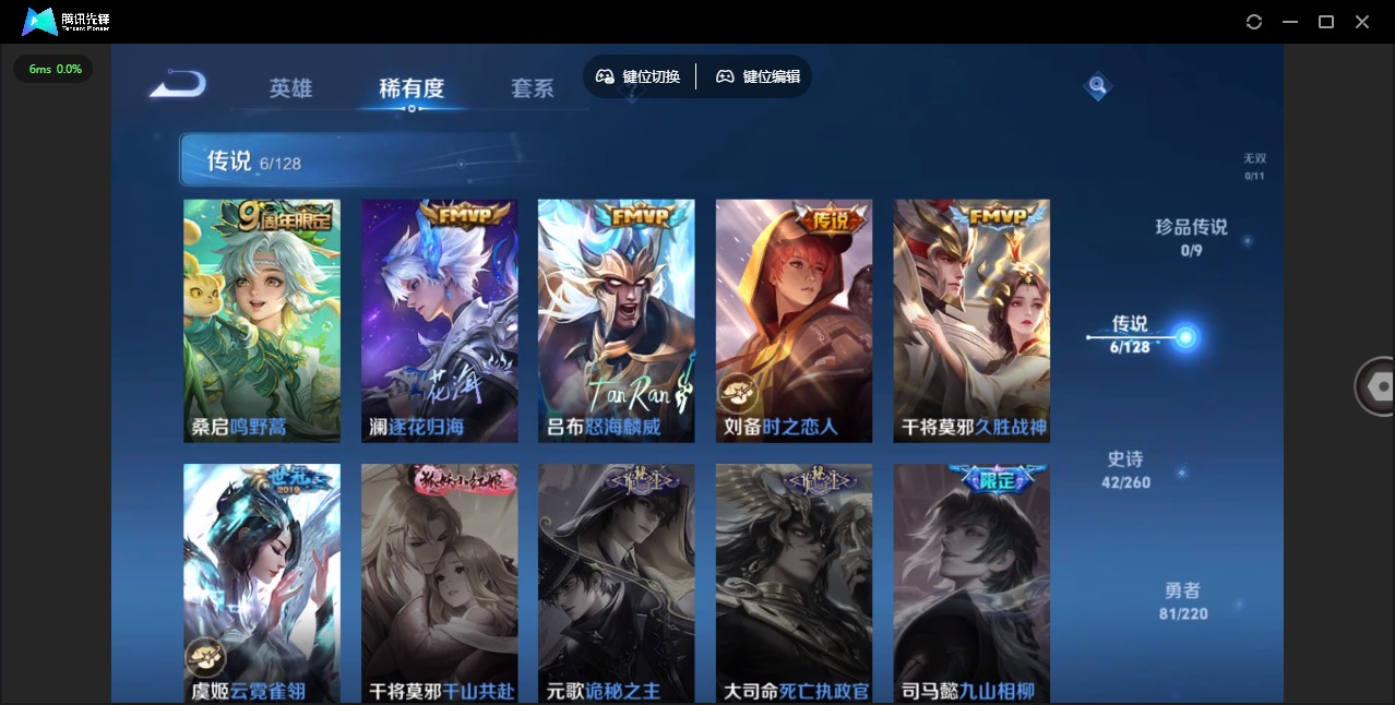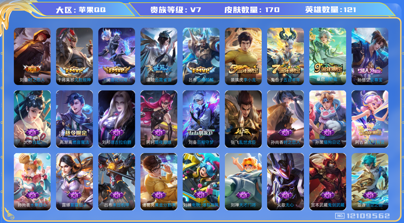 [12109562]V7 6传说 121英雄 170皮肤 可修改实名 优质装备:久胜战神,云霓雀翎,时之恋人-刘备(电焊工),澜逐花归海 珍宝阁皮:蔷薇恋人 限定皮:鸣野蒿,至尊宝,怒海麟威,五谷丰年,李小龙 史诗皮:龙之律动,破空之剑,紫霞仙子,白龙吟,黄金分割率,永昼,白蛇,江河有灵,高渐离燃音魔法,蒙恬荣光圣徽,电玩·爆裂旋风,晚萤,百相守梦(刘备),暗夜猫娘,末日机甲-吕布,猫狗日记-孙策,时之恋人-孙尚香,乱世虎臣,摇滚巨星,水果甜心,天才门将,功夫厨神,德古拉伯爵,鬼剑武藏,心灵战警,纤云弄巧,拒霜思,金属风暴,圣诞恋歌,鹰眼统帅,魅力维加斯,赏金猎手,无心