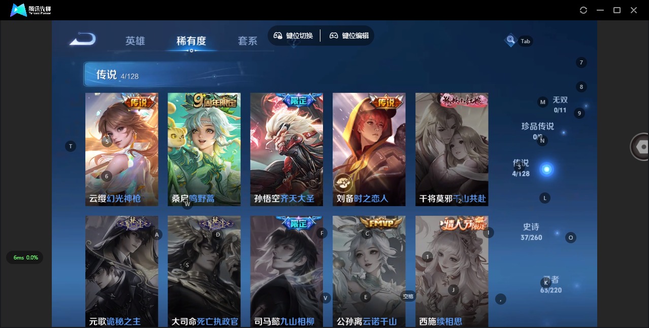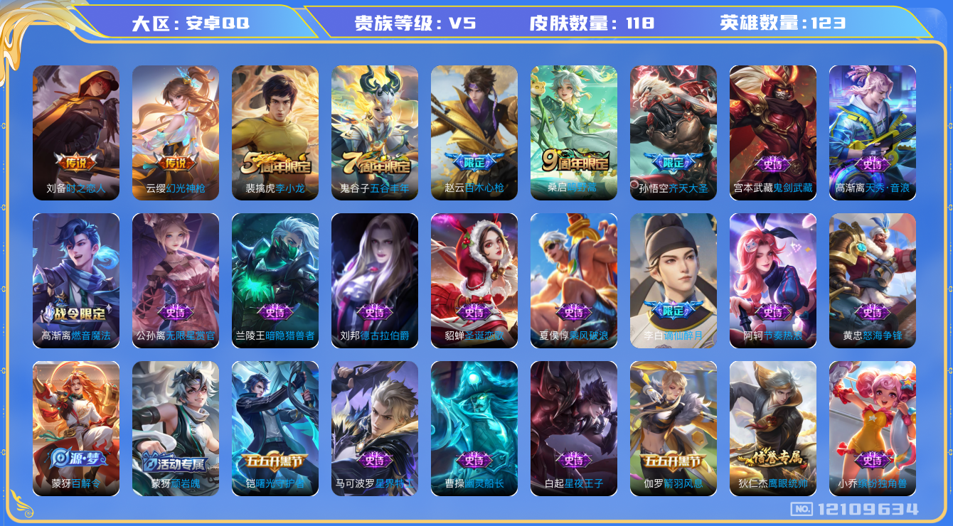 [12109634]V5 4传说 123英雄 118皮肤 可修改实名 优质装备:时之恋人-刘备(电焊工) 传说皮:幻光神枪 珍宝阁皮:蔷薇恋人 限定皮:鸣野蒿,齐天大圣,五谷丰年,李小龙,百木心枪 史诗皮:谪仙醉月,怒海争锋,战舞者,蒙犽顽岩魄,星界特工,江河有灵,百解令(蒙犽),高渐离燃音魔法,无限星赏官,冰冠公主,猫狗日记-孙策,节奏热浪,水果甜心,绅士熊喵,天才门将,星夜王子,德古拉伯爵,暗隐猎兽者,幽灵船长,鬼剑武藏,繁星吟游(呼啦呼啦),缤纷独角兽,乘风破浪,逐浪之夏,曙光守护者,箭羽风息,金属风暴,圣诞恋歌,鹰眼统帅,魅力维加斯,天秀·音浪