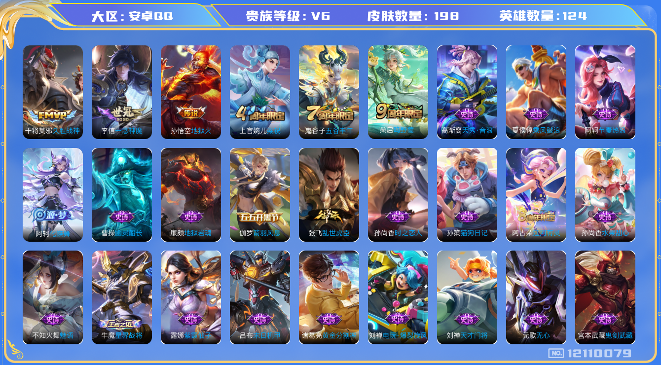 - [12254486]V10 2典藏 2珍品传说 63传说 126英雄 507皮肤 典藏英雄武则天 可修改实名 优质装备:幻阙歌(貂蝉典藏),最初的交响(伽罗典藏),江户川柯南,怪盗基德,黄金狮子座,云鹰飞将(小将军),久胜战神,炽阳神光,一念神魔,云霓雀翎,末日机甲-孙尚香(绿蚂蚱),仲夏夜之梦(大飞蛾),海洋之心,飞鸢探春,音你心动-周瑜,胖达荣荣,李逍遥,时之恋人-刘备(电焊工),游龙清影(小青龙),淬星耀世,超时空战士-狄仁杰,遇见胡旋,末日机甲-孙策,挚爱之约,无双飞将,神器·狴犴令,山海·炽霜斩(李信年限),燃星之曲,浮生妄,记忆之芯(机甲兔),百相守梦(张飞),鹤归松栖(云缨),惊梅引,霜月吟,澜逐花归海,艾琳觅芳踪,琥珀纪元马超,金乌负日,涂山容容 传说皮:乘龙·问璇玑(孙尚香年限),乘龙·铭钟鼎(赵云年限),乘龙·淬吴钩(孙策年限),貂蝉曦玄引,吕布曦玄引,落雪白狼,幻光神枪 珍宝阁皮:妄想食味,女武神,玩趣恶龙 限定皮:愿照·九州拓(澜年限),愿照·福禄聚(蔡文姬年限),愿照·岁时盈(虞姬年限),愿照·山河定(司空震年限),愿照·众生和(妲己年限),愿照·千秋盛(女娲年限),陌上桑,鸣野蒿,白虎志(电光耗子),凤求凰(白切鸡),太华(伽罗年限),异界灵契(白毛香),傲雪梅枪,补天,寅虎·展翼(孙膑年限),绯月行,白晶晶,时雨天司(水龙头),神威(电光马子),飞衡(韩信年限),玄嵩(庄周年限),遇见飞天,高山流水,匿光决锋者,五谷丰年,青龙志(铠年限),冰锋战神,幽恒(沐浴露),武圣,游园惊梦,梁祝,御风骁将(吕布年限),天狼狩猎者,逐梦之星,岱宗(典韦年限),天狼溯光者,祈雪灵祝(雪兔子),天狼绘梦者,李小龙,逐梦之影,玄武志(苏烈年限),朱雀志(守约年限),永曜之星,辉光之辰,如梦令-嫦娥,如梦令-后羿,霸王别姬-项羽,霸王别姬-虞姬,孙行者,猪悟能,一生所爱,青春决赛季,蜜橘之夏,神奇女侠,匿光追影者,女儿国国王,寅虎·御盾(廉颇年限),寅虎·瑞焰(虎皮蛋子),寅虎·心曲(虎婆),寅虎·赤拳(老虎年限),时之祈愿-云中君,玉兔公主,启示之音,深海之息(深海大菠萝),山海·玄木吟(马可年限) 史诗皮:飞车小橘子,器灵·浮梦炉,灵蛊蚀心,星界战将,石田雨龙,茶境仙,怒海争锋,破空之剑,战舞者,涂山红红,东方月初,蒙犽顽岩魄,埋骨钱,芈月浮光幕影,上官婉儿群星魔术团