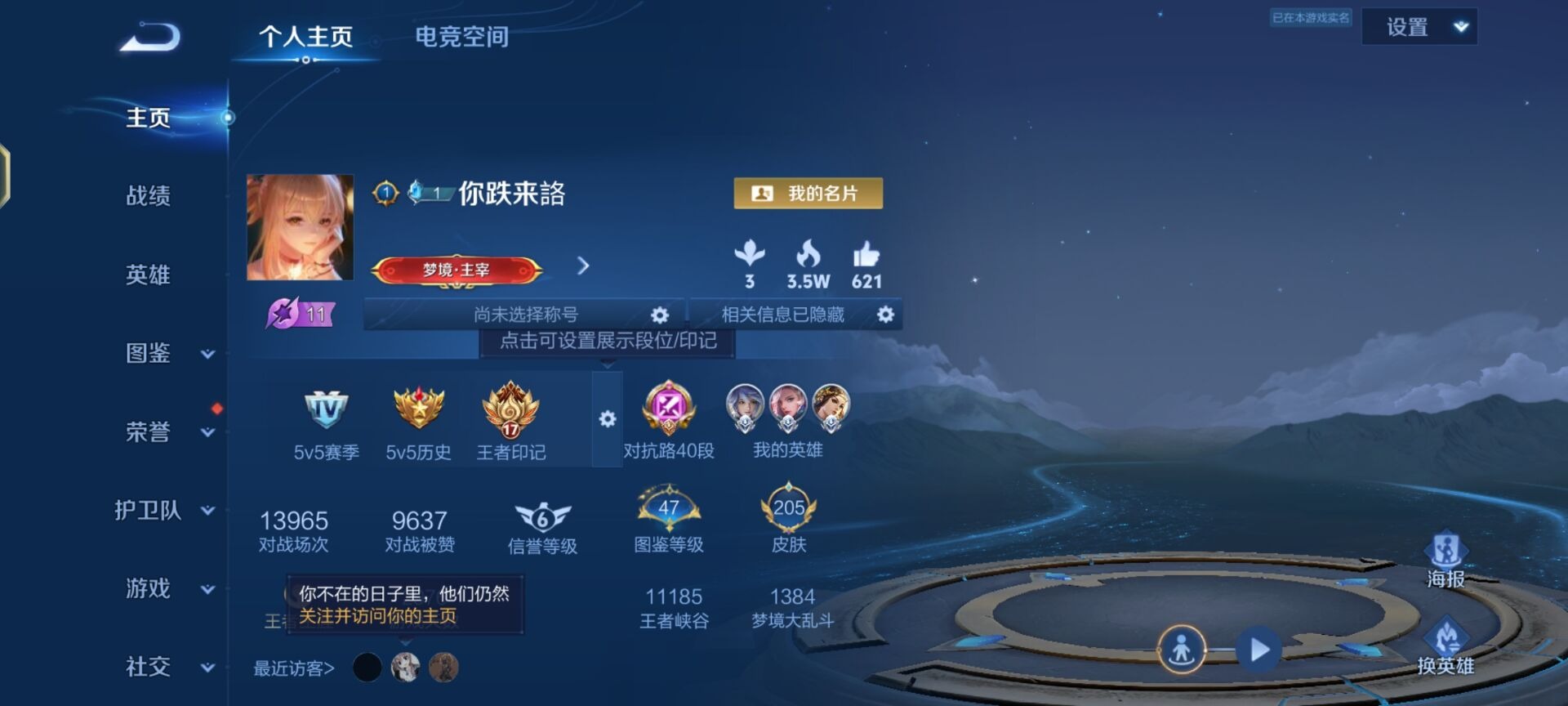 - [36997]英雄数: 86 皮肤数: 2 勇者皮肤数: 46 史诗皮肤数: 10 传说皮肤数: 1 稀有英雄: 艾琳,娜可露露,不知火舞,桑启,戈娅 当前段位: 星耀 限定皮肤: 高山流水,五谷丰年 内测皮肤: 女武神 史诗皮肤: 逐浪之夏,水果甜心,乘风破浪,水晶猎龙者 赛季/战令皮肤: 朔风刀,混沌棋,疑决卦,醍醐杖,原初探秘者,万华元夜,演武夺筹,驱傩正仪,千军破阵,星际陆战队(达摩),金庭之子,大漠名商,云中旅人,海盐诗旅 实名: 无人脸修改机会/实名是本人 普通皮肤: 五福同心,龙腾万里,归虚梦演(鲁班大师),归虚梦演(曜),掌控之力,守护之力,化身博士,缤纷绘卷,黄金武士,天使之翼,红桃皇后,星际陆战队(程咬金),阴阳师,汉昭烈帝,兔女郎,死亡骑士,救世之瞳,白色死神,野性能量,冰雪圆舞曲,露花倒影,花见巫女,未来旅行,龙域领主,蔷薇王座,万圣前夜,异域舞娘,潮流仙人,东海龙王,战争女神,精灵王,加勒比小姐,死神来了,赤焰之缨,启蛰,棒球奇才,海之征途,精准探案法,花间舞,绝影神枪,阿摩司公爵,特种部队,隐刃,木偶奇遇记,海军大将,一千零一夜,英喵野望,前尘,碧珀绯影