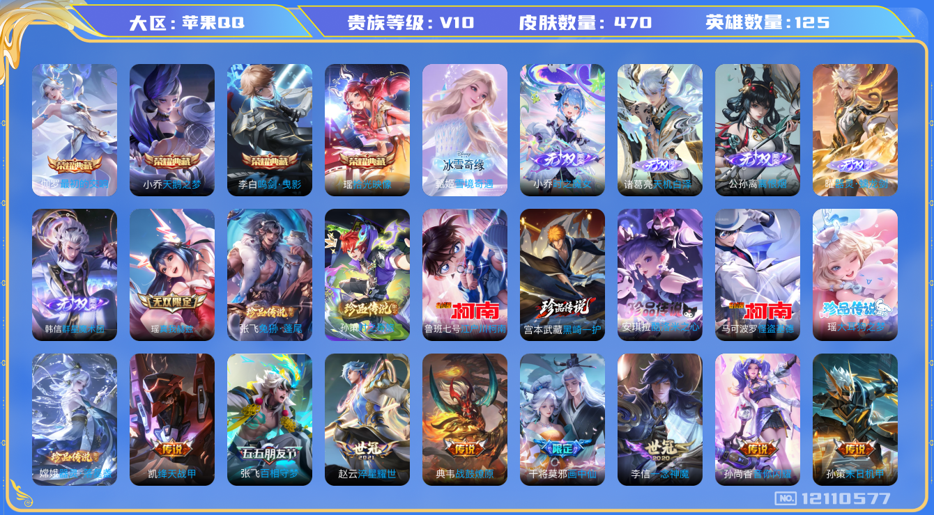 [12110577]V10 4典藏 7无双 8珍品传说 51传说 125英雄 470皮肤 可修改实名 连体和平 优质装备:天鹅之梦(小乔典藏),鸣剑·曳影,真我赫兹(瑶)(瑶无双),小乔时之魔女(小乔无双),韩信群星魔术团(韩信无双),离恨烟(公孙离无双),拾光映像(瑶典藏),雪境奇遇-甄姬,器灵·螭龙剑,最初的交响(伽罗典藏),天机白泽,江户川柯南,怪盗基德,器灵·落星盏,酷洛米之心,大耳狗之梦,黑崎一护,黄金狮子座,黄金射手座,冠军飞将,云鹰飞将(小将军),绛天战甲(鸡嘴战神),黄金白羊座,炽阳神光,一念神魔,末日机甲-孙尚香(绿蚂蚱),地狱火,仲夏夜之梦(大飞蛾),零号·赤焰,地狱之眼,音你心动-周瑜,胖达荣荣,游龙清影(小青龙),淬星耀世,超时空战士-狄仁杰,末日机甲-孙策,无双飞将,音你闪耀(rap皮),碎云,画中仙,百相守梦(张飞),电玩·雷克斯,妄想实况,惊梅引,澜逐花归海,艾琳觅芳踪,千劫归真,涂山容容 珍品传说:时之奇旅-孙策,兔狲·蓬尾 传说皮:典韦战鼓燎原,云诺千山,续相思,星之鸣奏,祥瑞亨通,幻光神枪 珍宝阁皮:蔷薇恋人,玩趣恶龙 限定皮:愿照·九州拓(澜年限),愿照·福禄聚(蔡文姬年限),愿照·岁时盈(虞姬年限),愿照·山河定(司空震年限),愿照·众生和(妲己年限),愿照·千秋盛(女娲年限),逐霄战戟,鸣野蒿,至尊宝,凤求凰(白切鸡),傲雪梅枪,绯月行,时雨天司(水龙头),神威(电光马子),飞衡(韩信年限),至美·乘鲤谣,影龙天霄,高山流水,齐天大圣,怒海麟威,降魔,游园惊梦,梁祝,御风骁将(吕布年限),逐梦之星,烈魂,岱宗(典韦年限),逐梦之音,天狼征服者,祈雪灵祝(雪兔子),李小龙,逐梦之影,辉光之辰,孙行者,猪悟能,大圣娶亲,引擎之心,冰霜恋舞曲,百木心枪,山海·玄木吟(马可年限),冰霜神祇 史诗皮:鸭鸭历险记-刘禅,苍鳞隐世,器灵·浮梦炉,糖绘人间,狼魂孤将,绮世丹青,化蝶舞,灵蛊蚀心,星界战将,谪仙醉月,龙之律动,雪豹·霜爪,藏狐·褐绒,石田雨龙,百相守梦-周瑜,茶境仙,幻珠鲛人,怒海争锋,撼地雄心,破空之剑,战舞者,涂山红红,东方月初,蒙犽顽岩魄,埋骨钱,芈月浮光幕影,蔬乡物语(鲁班七号),百相守梦-百里守约,星界特工,百相守梦-黄忠,织梦人,遇见神鹿,紫霞仙子,苍穹之光,电玩小子(小书包),白龙吟,黄金分割率,特工魅影,千年之狐,永昼