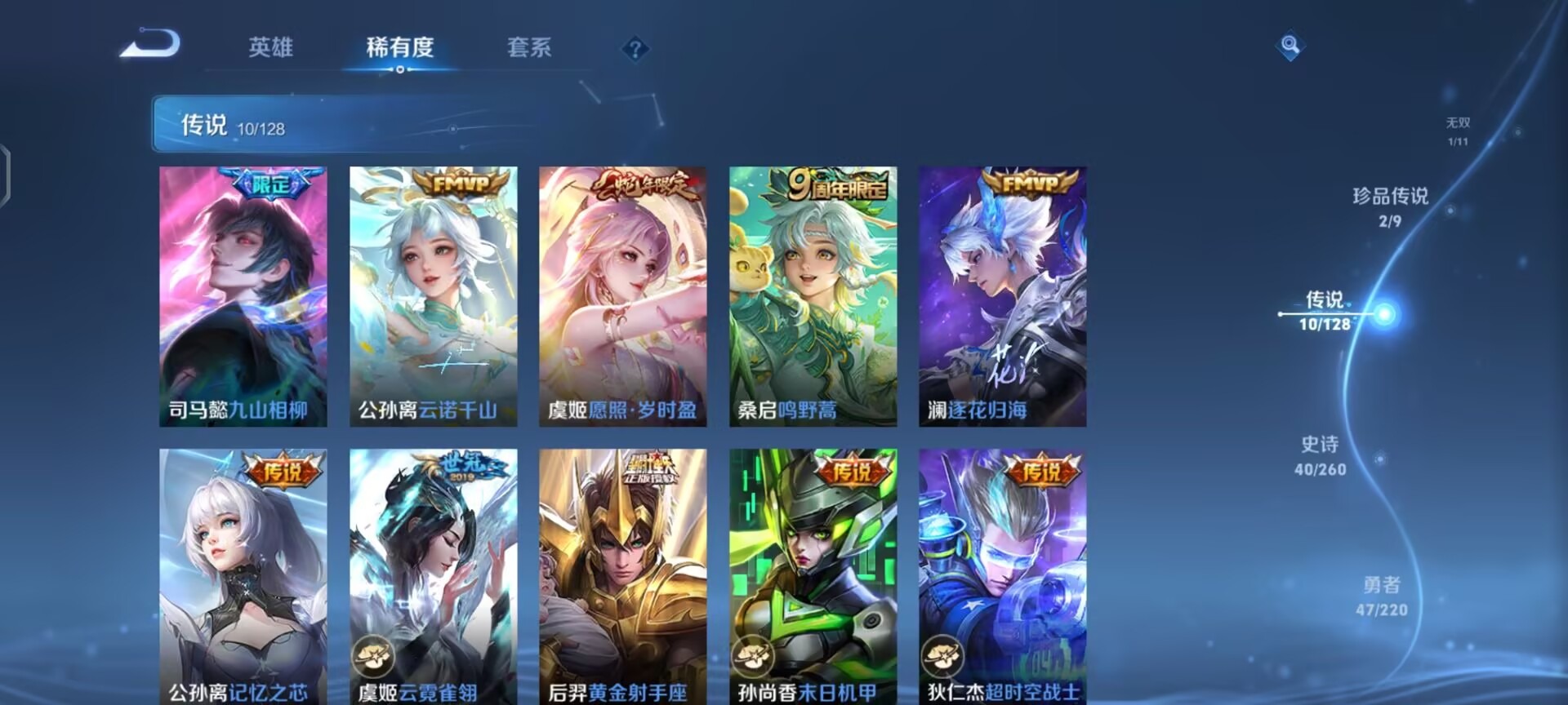 - PX_2090155-实名: 可修改 贵族等级: V8 英雄数: 124 皮肤数: 206 荣耀水晶: 天鹅之梦 无双皮: 真我赫兹(瑶) 珍品传说: 器灵·落星盏 星传说: 金色仲夏夜 传说皮: 黄金射手座,仲夏夜之梦,游龙清影,挚爱花嫁,永恒水手月亮,夜礼服假面,幻光神枪 限定皮: 李小龙,祈雪灵祝,白鹤梁神女,魔法小厨娘,白晶晶,天狼溯光者,奇迹圣诞,冰霜恋舞曲,天狼运算者,天狼绘梦者,如梦