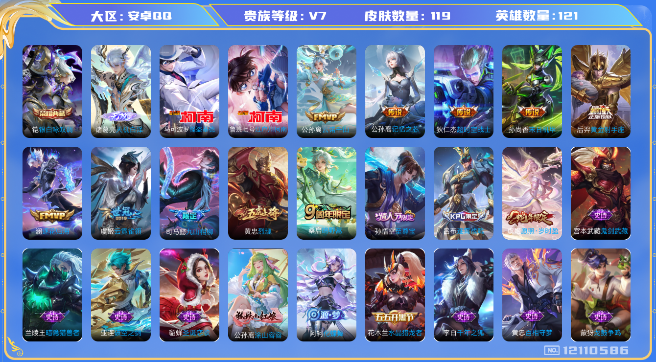 [12110586]V7 1典藏 1无双 2珍品传说 10传说 121英雄 119皮肤 可修改实名 优质装备:银白咏叹调(倪克斯侍卫),天机白泽,江户川柯南,怪盗基德,黄金射手座,云霓雀翎,末日机甲-孙尚香(绿蚂蚱),超时空战士-狄仁杰,记忆之芯(机甲兔),澜逐花归海,涂山容容 传说皮:九山相柳,云诺千山 限定皮:愿照·岁时盈(虞姬年限),逐霄战戟,鸣野蒿,至尊宝,烈魂 史诗皮:鸭鸭历险记-刘禅,绮世丹青,化蝶舞,灵蛊蚀心,龙之律动,雪豹·霜爪,百相守梦-周瑜,幻珠鲛人,破空之剑,百相守梦-百里守约,星界特工,百相守梦-黄忠,特工魅影,千年之狐,末日机甲-莱西奥,偶像歌手,晚萤,水果甜心,天才门将,暗隐猎兽者,鬼剑武藏,舞动绿茵,龙鼓争鸣,水晶猎龙者,曙光守护者,箭羽风息,金属风暴,原初追逐者,圣诞恋歌,鹰眼统帅,魅力维加斯
