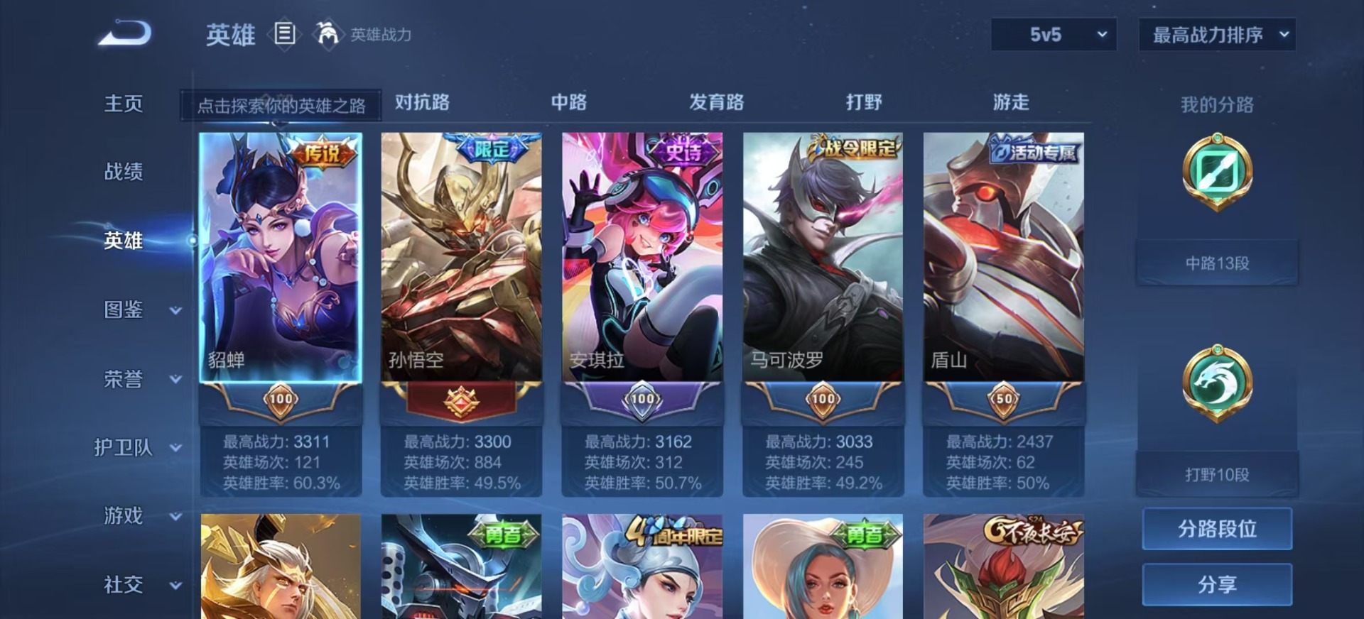 - PX_2105182-实名: 可修改 贵族等级: V7 英雄数: 121 皮肤数: 145 荣耀水晶: 鸣剑·曳影 传说皮: 黄金射手座,幻光神枪 限定皮: 遇见飞天,李小龙,游园惊梦,梁祝,天魔缭乱,至尊宝,如梦令-后羿,猪悟能,齐天大圣,愿照·众生和,愿照·岁时盈