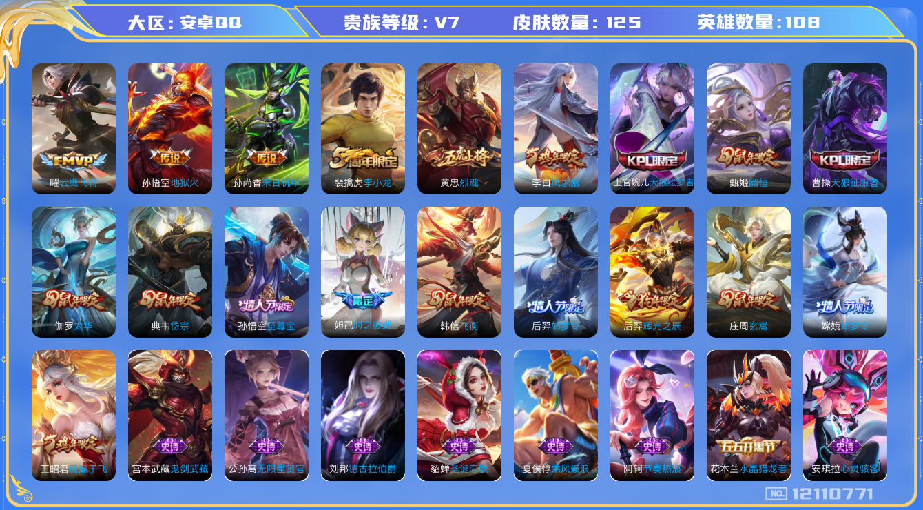 [12110771]V7 5传说 108英雄 125皮肤 可修改实名 优质装备:云鹰飞将(小将军),末日机甲-孙尚香(绿蚂蚱),地狱火 限定皮:至尊宝,凤求凰(白切鸡),凤凰于飞,太华(伽罗年限),时之彼端,飞衡(韩信年限),玄嵩(庄周年限),幽恒(沐浴露),烈魂,岱宗(典韦年限),天狼征服者,天狼绘梦者,李小龙,辉光之辰,如梦令-嫦娥,如梦令-后羿 史诗皮:特工魅影,魅语,无限星赏官,青蛇,时之恋人-孙尚香,节奏热浪,修罗,星夜王子,心灵骇客,德古拉伯爵,鬼剑武藏,舞动绿茵,地狱岩魂,繁星吟游(呼啦呼啦),乘风破浪,水晶猎龙者,曙光守护者,箭羽风息,金属风暴,圣诞狂欢,圣诞恋歌,鹰眼统帅,暗夜贵公子,魅力维加斯