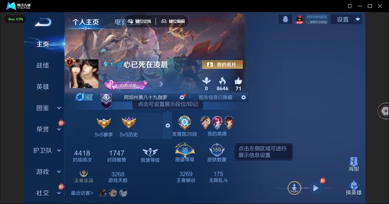 - [11235170]V8 1典藏 14传说 124英雄 262皮肤 可修改实名 优质装备:鸣剑·曳影,黄金白羊座,久胜战神,炽阳神光,一念神魔,末日机甲-孙尚香(绿蚂蚱),时之恋人-刘备(电焊工) 传说皮:幻光神枪 珍宝阁皮:妄想食味,蔷薇恋人 限定皮:愿照·福禄聚(蔡文姬年限),愿照·山河定(司空震年限),至尊宝,白虎志(电光耗子),凤求凰(白切鸡),白晶晶,时雨天司(水龙头),飞衡(韩信年限),瑞麟志(木兰年限),遇见飞天,青龙志(铠年限),冰锋战神,游园惊梦,梁祝,天狼狩猎者,天狼溯光者,李小龙,逐梦之影,霸王别姬-虞姬,默契交锋-花木兰,大圣娶亲,青春决赛季,冰霜恋舞曲,寅虎·瑞焰(虎皮蛋子) 史诗皮:茶境仙,百相守梦-黄忠,紫霞仙子,苍穹之光,特工魅影,千年之狐,江河有灵,偶像歌手,暗夜猫娘,魅语,无限星赏官,晚萤,冰冠公主,末日机甲-吕布,猫狗日记-孙策,节奏热浪,女仆咖啡,摇滚巨星,水果甜心,绅士熊喵,星夜王子,功夫厨神,德古拉伯爵,暗隐猎兽者,幽灵船长,鬼剑武藏,天秀·启明,舞动绿茵,地狱岩魂,纤云弄巧,繁星吟游(呼啦呼啦),缤纷独角兽,水晶猎龙者,金属风暴,原初追逐者,圣诞狂欢,圣诞恋歌,鹰眼统帅,暗夜贵公子,魅力维加斯,黎明之约,未来纪元-赵云