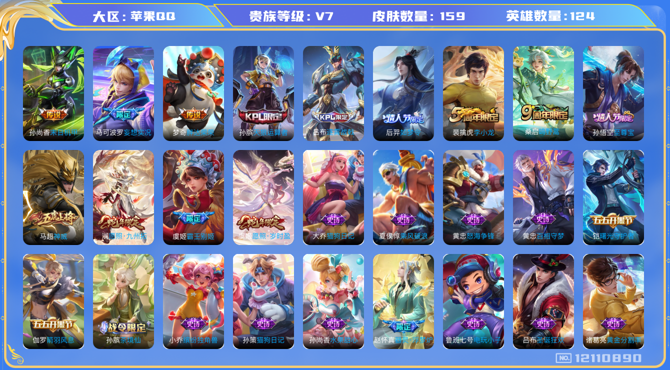 [12110890]V7 6传说 124英雄 159皮肤 可修改实名 优质装备:末日机甲-孙尚香(绿蚂蚱),胖达荣荣,妄想实况 珍宝阁皮:蔷薇恋人 限定皮:愿照·九州拓(澜年限),愿照·岁时盈(虞姬年限),逐霄战戟,鸣野蒿,至尊宝,神威(电光马子),天狼运算者,李小龙,如梦令-后羿,霸王别姬-虞姬 史诗皮:器灵·浮梦炉,茶境仙,怒海争锋,炽弈燎原,百相守梦-百里守约,百相守梦-黄忠,电玩小子(小书包),黄金分割率,特工魅影,偶像歌手,猫狗日记-孙策,猫狗日记-大乔,修罗,女仆咖啡,摇滚巨星,水果甜心,天才门将,功夫厨神,鬼剑武藏,心灵战警,舞动绿茵,繁星吟游(呼啦呼啦),缤纷独角兽,乘风破浪,逐浪之夏,曙光守护者,热力回旋,箭羽风息,圣诞狂欢,圣诞恋歌,鹰眼统帅