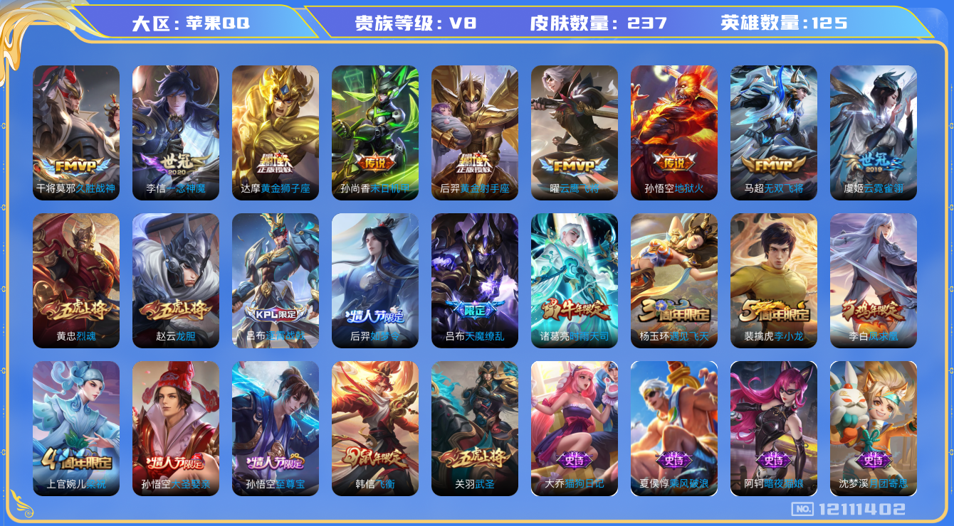 - [11529175]V7 1典藏 7传说 124英雄 337皮肤 可修改实名 优质装备:神鉴启示录,地狱之眼,霜月吟,涂山容容 传说皮:幻光神枪 珍宝阁皮:万物之道,蔷薇恋人,女武神 限定皮:愿照·九州拓(澜年限),逐霄战戟,鸣野蒿,傲雪梅枪,神威(电光马子),遇见飞天,高山流水,怒海麟威,五谷丰年,天狼狩猎者,岱宗(典韦年限),李小龙,猪悟能,大圣娶亲,寅虎·赤拳(老虎年限),神器·万象笔 史诗皮:鸭鸭历险记-刘禅,飞车小橘子,器灵·浮梦炉,化蝶舞,星界战将,谪仙醉月,龙之律动,石田雨龙,百相守梦-周瑜,茶境仙,破空之剑,蔬乡物语(鲁班七号),百相守梦-百里守约,百相守梦-黄忠,遇见神鹿,电玩小子(小书包),黄金分割率,特工魅影,千年之狐,江河有灵,匿光侦查者,魅语,百解令(蒙犽),高渐离燃音魔法,蒙恬荣光圣徽,无限星赏官,冰冠公主,白蛇,晚萤,电玩·爆裂旋风,百相守梦(刘备),末日机甲-吕布,猫狗日记-孙策,猫狗日记-大乔,时之恋人-孙尚香,乱世虎臣,节奏热浪,修罗,女仆咖啡,摇滚巨星,水果甜心,绅士熊喵,天才门将,星夜王子,心灵骇客,功夫厨神,德古拉伯爵,暗隐猎兽者,幽灵船长,鬼剑武藏,心灵战警,舞动绿茵,地狱岩魂,纤云弄巧,繁星吟游(呼啦呼啦),拒霜思,缤纷独角兽,乘风破浪,逐浪之夏,水晶猎龙者,曙光守护者,箭羽风息,唤灵魅影,金属风暴,原初追逐者,圣诞狂欢,圣诞恋歌,鹰眼统帅,暗夜贵公子,魅力维加斯,黎明之约,滕王阁序,无心,未来纪元-赵云