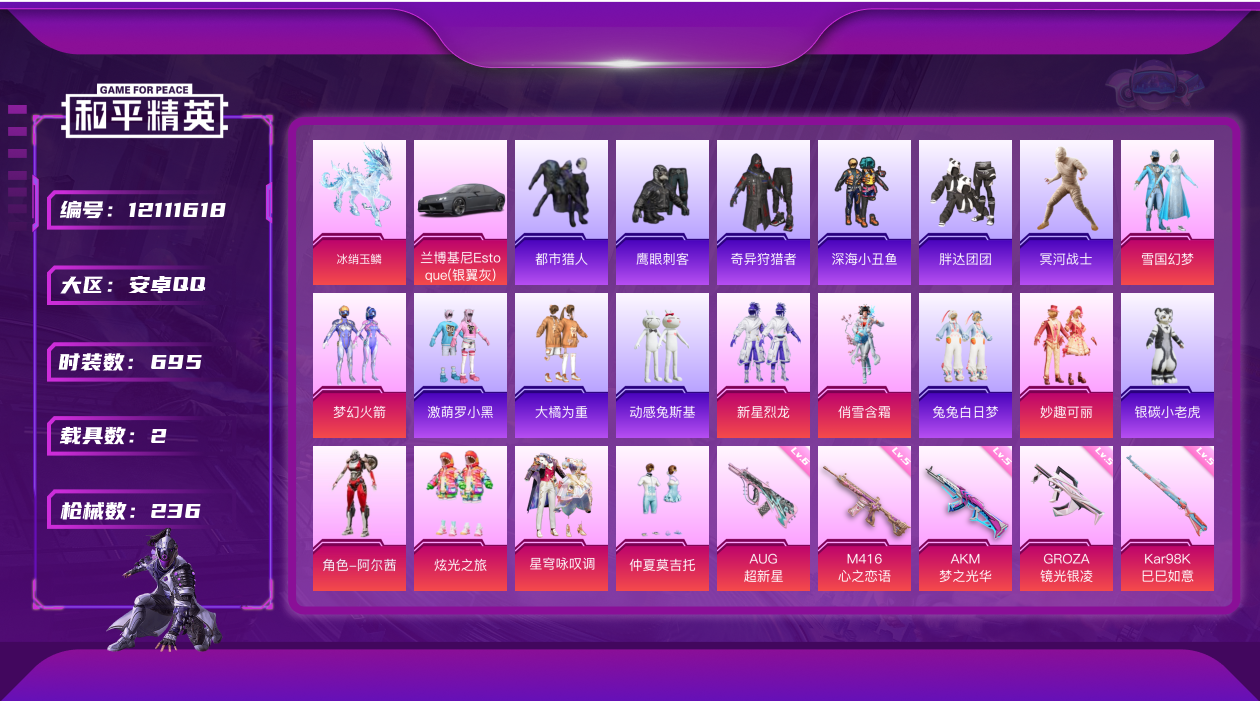 [12111618]9粉装 15特效枪 2载具 16印记 可二次 可修改实名 身法装备:都市猎人,暗影哥特(红眼罩),冥河战士(老木乃伊),ACT追光队服,萌熊伴侣背包(粉熊背包) 优质装备:冥河战士(老木乃伊),木乃伊套装(老)(冥河战士),雪国幻梦(冰雪女王),兰博基尼Estoque(银翼灰),都市猎人,萌熊伴侣背包(粉熊背包),AKM炫紫旋律,M416心之恋语,奇异狩猎者,梦幻火箭(新101)(新火箭少女101粉色套装),新星烈龙(小白龙),AKM梦之光华,M416风花雪月,SCAR-L纯梦嫁纱,AUG超新星,MG3酷泡奶龙,GROZA-镜光银凌,AKS-74U-信仰神谕,破片手榴弹-热量炸弹,星穹咏叹调,MK14-甜梦熊击,Kar98K-巳巳如意 热门装扮:俏雪含霜,妙趣可丽,仲夏莫吉托,阿尔茜,炫光之旅,兔兔白日梦,动感兔斯基,胖达团团,激萌罗小黑,大橘为重,鹰眼刺客,深海小丑鱼,都市猎人,银碳小老虎 载具:冰绡玉鳞 稀有枪皮:P90-魔童闹海 敖丙,SCAR-L-魔童闹海 哪吒,DP-28-豹影疾电 六级特效枪:六级AUG-超新星 五级特效枪:五级GROZA-镜光银凌,五级AKS-74U-信仰神谕,五级M416-心之恋语,五级Kar98K-巳巳如意,五级DP-28-豹影疾电,五级MK14-甜梦熊击,五级破片手榴弹-热量炸弹,五级MG3-酷泡奶龙,五级AKM-梦之光华 三级特效枪:三级P90-魔童闹海 敖丙,三级SCAR-L-魔童闹海 哪吒 二级特效枪:二级M416-风花雪月 一级特效枪:一级AKM-炫紫旋律,一级SCAR-L-纯梦嫁纱 紫色装扮:幻彩翩翩,SS23特训,妙红点点,SS30特训套装,SS31特训套装,云朵鹅,彩虹兔,雪绒豹,SS33特训套装,旭日情侣,灵蜜圈圈,飞狐塔尔斯,SS21特训,绚烂繁星,田园牧歌,轻风白浪,和煦暖阳,SS22特训,香榭午后,龙舌兰冰茶,顶瓜瓜,北国孤狼,坚韧舞者,夏日倾情,夏日音浪,幻世战舞者,萌趣咩咩,六六大吉,军械专家,娇憨猪猪,SS16特训,瑞龙福将,团圆交子,醒狮腾龙,SS17特训,迪迦奥特曼,SS20特训,香草威化,甜心亚梦,虚音幻奏,怒火燎原,异彩先驱,SS18特训,雪兔飞飞,飞驰魅影,音速流光,极速竞梦,SS19特训,飞行日记,魅力单车,鹤鸣,麻辣教官,黄色伏地魔,黎明保卫者,黑色伏地魔,龙的传人,龙腾端午,龟仙人,蝶变