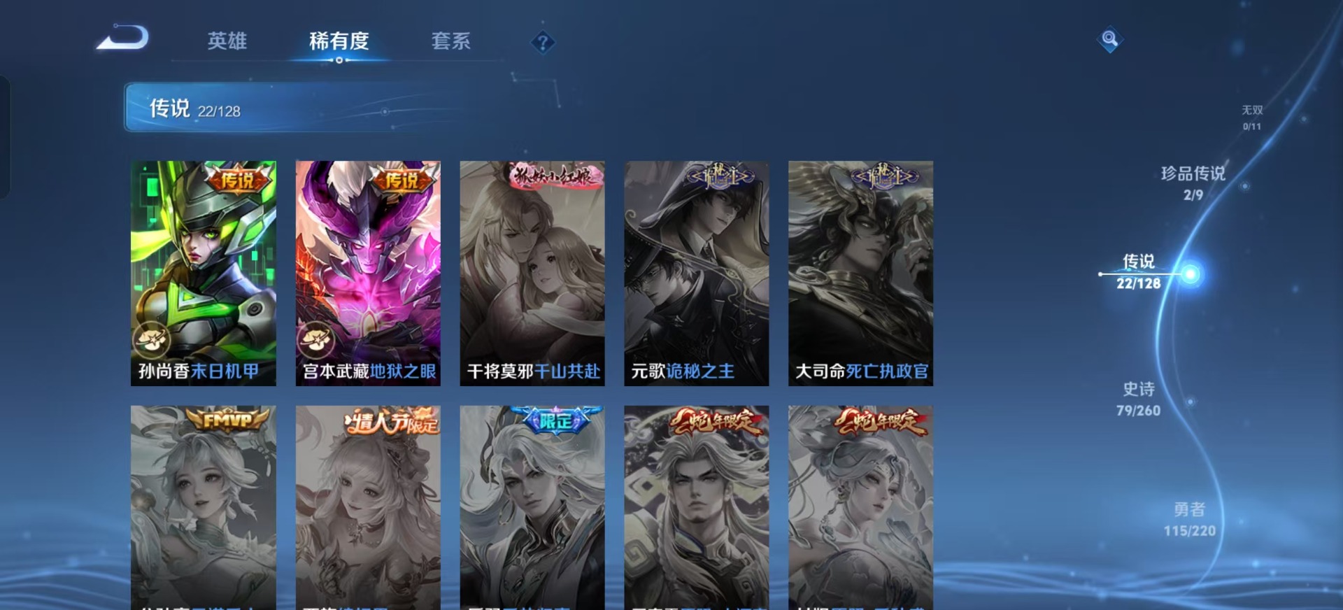 - [12089875]V9 3典藏 2珍品传说 23传说 125英雄 348皮肤 典藏英雄武则天 可修改实名 优质装备:鸣剑·曳影,全息碎影(猴子典藏),星域神启(倪克斯贼亮),黄金狮子座,黄金白羊座,猫影幻舞,久胜战神,末日机甲-孙尚香(绿蚂蚱),地狱火,仲夏夜之梦(大飞蛾),海洋之心,地狱之眼,李逍遥,超时空战士-狄仁杰,末日机甲-孙策,挚爱之约,碎云,涂山容容 珍品传说:时之奇旅-孙策,兔狲·蓬尾 传说皮:典韦战鼓燎原 珍宝阁皮:妄想食味,优雅恋人,蔷薇恋人 限定皮:愿照·岁时盈(虞姬年限),鸣野蒿,至尊宝,白虎志(电光耗子),凤求凰(白切鸡),武陵仙君(小桃花),傲雪梅枪,魔法小厨娘,飞衡(韩信年限),遇见飞天,高山流水,降魔,五谷丰年,冰锋战神,梁祝,天狼征服者,李小龙,逐梦之影,朱雀志(守约年限),辉光之辰,如梦令-后羿,圣诞老人,真爱至上,猪悟能,大圣娶亲,引擎之心,天魔缭乱,蜜橘之夏,深海之息(深海大菠萝),神器·万象笔 史诗皮:鸭鸭历险记-刘禅,器灵·浮梦炉,化蝶舞,星界战将,龙之律动,小牛鸭,石田雨龙,茶境仙,破空之剑,遇见神鹿,紫霞仙子,电玩小子(小书包),黄金分割率,特工魅影,千年之狐,永昼,江河有灵,魅语,百解令(蒙犽),蒙恬荣光圣徽,无限星赏官,青蛇,偶像歌手,白蛇,晚萤,暗夜猫娘,银翎春语,龙骑士(小龙虾),末日机甲-吕布,猫狗日记-孙策,猫狗日记-大乔,乱世虎臣,节奏热浪,修罗,女仆咖啡,摇滚巨星,水果甜心,绅士熊喵,天才门将,星夜王子,心灵骇客,功夫厨神,德古拉伯爵,暗隐猎兽者,幽灵船长,鬼剑武藏,暗渊魔法,心灵战警,乐园奇幻夜,天秀·启明,舞动绿茵,地狱岩魂,诗语江南,纤云弄巧,繁星吟游(呼啦呼啦),拒霜思,缤纷独角兽,乘风破浪,逐浪之夏,水晶猎龙者,曙光守护者,箭羽风息,金属风暴,原初追逐者,圣诞狂欢,圣诞恋歌,鹰眼统帅,魅力维加斯,黎明之约,未来纪元-赵云