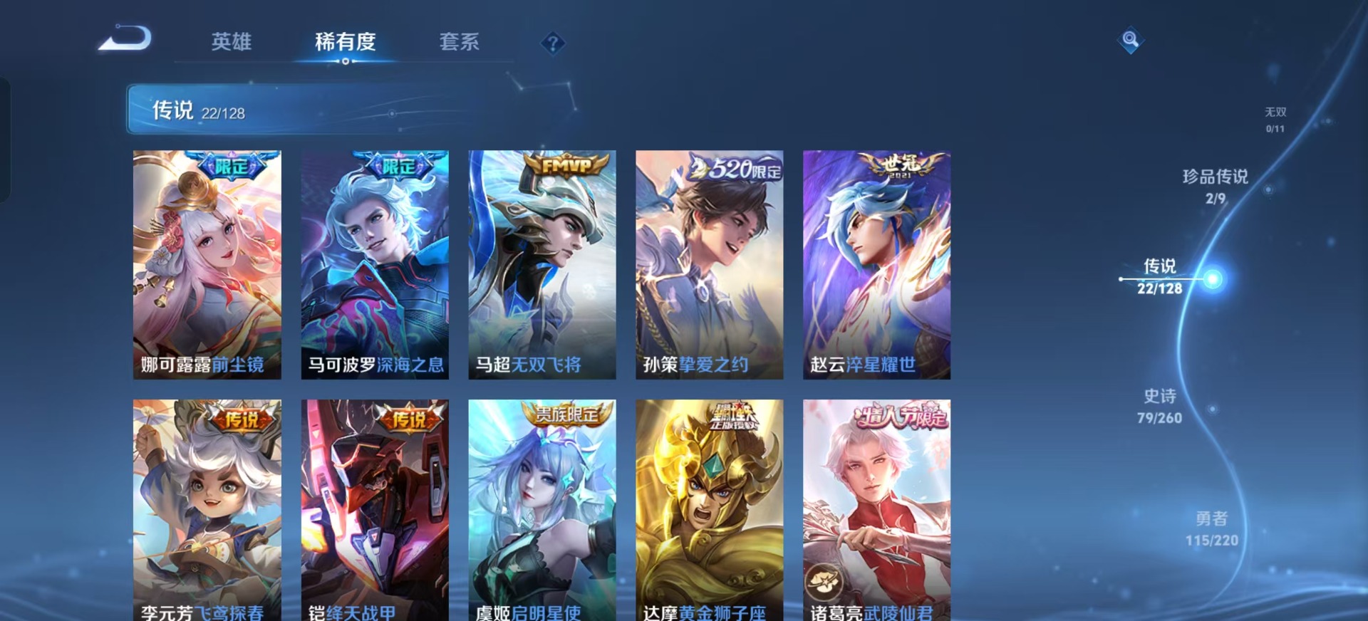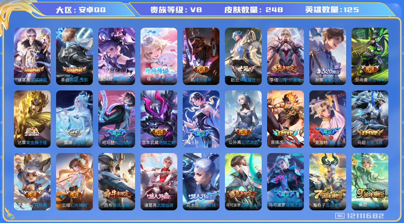[12111682]V8 2典藏 2珍品传说 22传说 125英雄 248皮肤 可修改实名 诸葛亮小国标 优质装备:鸣剑·曳影,星域神启(倪克斯贼亮),酷洛米之心,大耳狗之梦,黄金狮子座,绛天战甲(鸡嘴战神),末日机甲-孙尚香(绿蚂蚱),地狱之眼,飞鸢探春,淬星耀世,挚爱之约,无双飞将,山海·炽霜斩(李信年限),浮生妄,记忆之芯(机甲兔),霜月吟,涂山容容 传说皮:九山相柳,星之鸣奏,祥瑞亨通,幻光神枪 珍宝阁皮:优雅恋人,女武神,玩趣恶龙 限定皮:愿照·岁时盈(虞姬年限),鸣野蒿,至尊宝,武陵仙君(小桃花),傲雪梅枪,前尘镜,五谷丰年,御风骁将(吕布年限),默契交锋-花木兰,孙行者,猪悟能,深海之息(深海大菠萝),时之奇旅-妲己,山海·玄木吟(马可年限) 史诗皮:鸭鸭历险记-刘禅,器灵·浮梦炉,化蝶舞,星界战将,龙之律动,雪豹·霜爪,藏狐·褐绒,石田雨龙,百相守梦-周瑜,茶境仙,幻珠鲛人,炽弈燎原,蔬乡物语(鲁班七号),百相守梦-黄忠,织梦人,守夜人,紫霞仙子,电玩小子(小书包),黄金分割率,千年之狐,魅语,高渐离燃音魔法,蒙恬荣光圣徽,冰冠公主,青蛇,偶像歌手,银翎春语,末日机甲-吕布,猫狗日记-孙策,乱世虎臣,女仆咖啡,水果甜心,绅士熊喵,时之奇旅-安琪拉,功夫厨神,德古拉伯爵,暗隐猎兽者,幽灵船长,鬼剑武藏,心灵战警,乐园奇幻夜,舞动绿茵,地狱岩魂,拒霜思,缤纷独角兽,乘风破浪,逐浪之夏,水晶猎龙者,曙光守护者,箭羽风息,唤灵魅影,金属风暴,圣诞狂欢,圣诞恋歌,鹰眼统帅,黎明之约,天秀·音浪,未来纪元-赵云