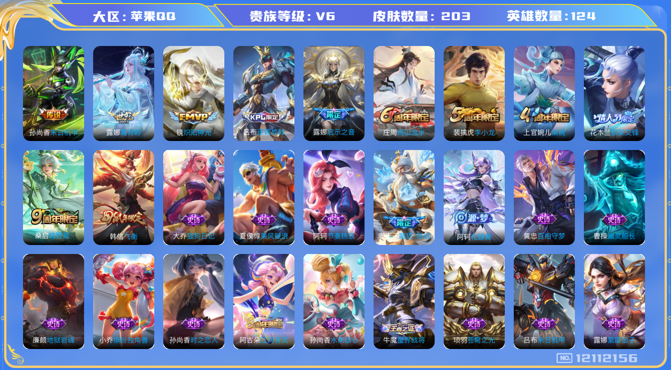 - PX_2077624-实名: 可修改 贵族等级: V9 英雄数: 124 皮肤数: 314 荣耀水晶: 天鹅之梦,银白咏叹调 珍品传说: 怪盗基德 传说皮: 黄金射手座,绛天战甲,炽阳神光,一念神魔,音你心动-周瑜,胖达荣荣,时之恋人-刘备,超时空战士-狄仁杰,无双飞将,碎云,山海·炽霜斩,山海·琳琅生,山海·苍雷引,燃星之曲,记忆之芯,电玩·雷克斯,鹤羽星尊,鹤归松栖(云缨),澜逐花归海,琥珀纪