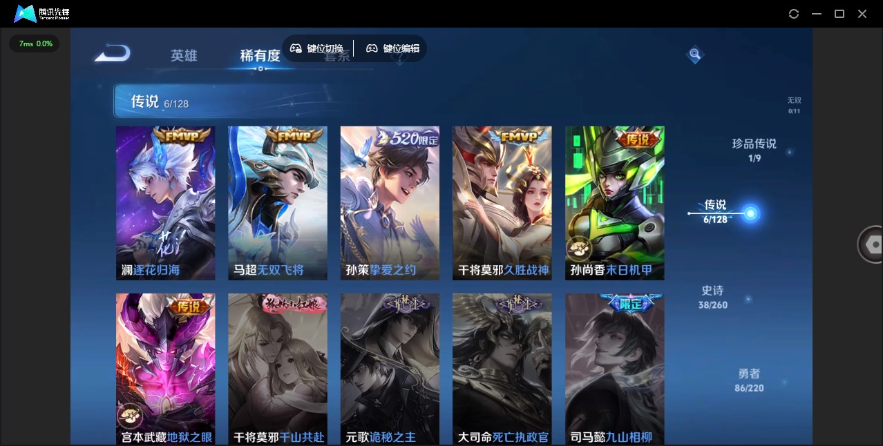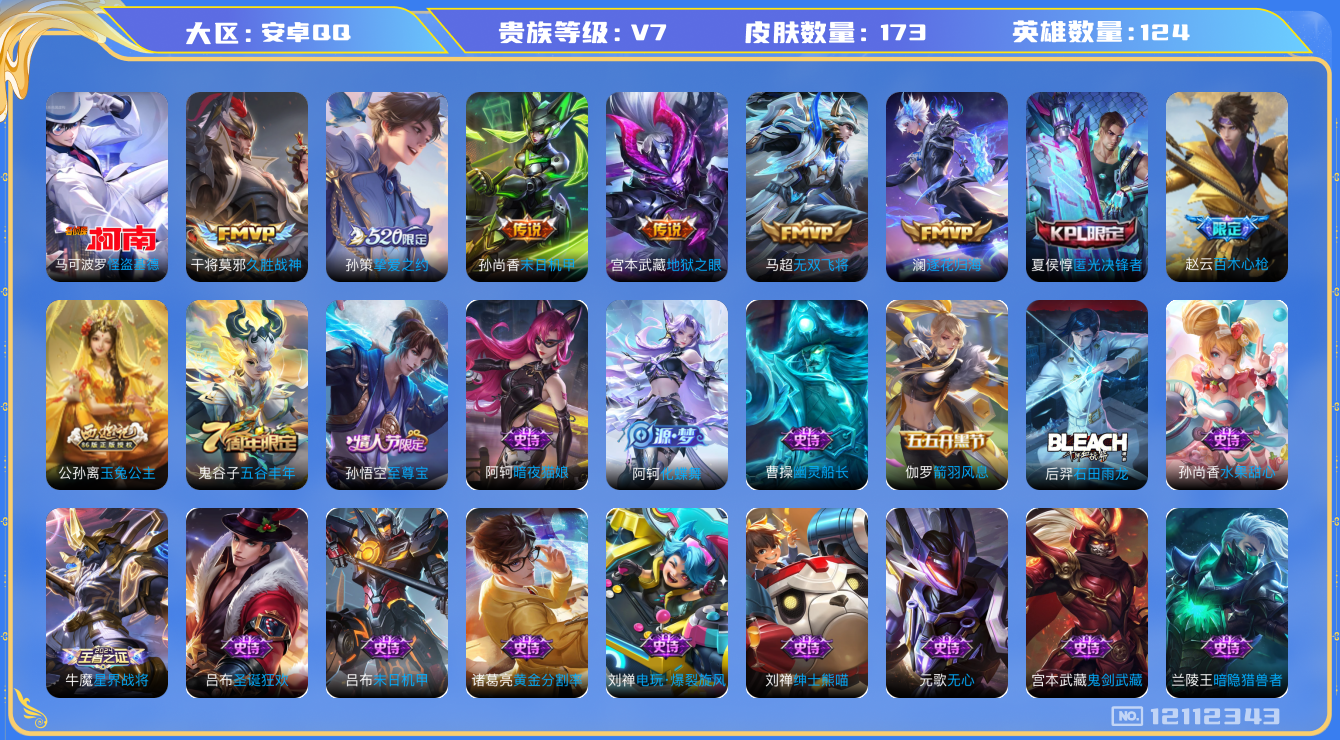[12112343]V7 1珍品传说 6传说 124英雄 173皮肤 可修改实名 优质装备:怪盗基德,久胜战神,末日机甲-孙尚香(绿蚂蚱),地狱之眼,挚爱之约,无双飞将,澜逐花归海 珍宝阁皮:蔷薇恋人 限定皮:至尊宝,匿光决锋者,五谷丰年,百木心枪,玉兔公主 史诗皮:化蝶舞,星界战将,龙之律动,石田雨龙,遇见神鹿,白龙吟,黄金分割率,千年之狐,电玩·爆裂旋风,暗夜猫娘,末日机甲-吕布,女仆咖啡,水果甜心,绅士熊喵,星夜王子,暗隐猎兽者,幽灵船长,鬼剑武藏,心灵战警,纤云弄巧,热力回旋,箭羽风息,金属风暴,圣诞狂欢,鹰眼统帅,奇遇舞章,无心,未来纪元-赵云