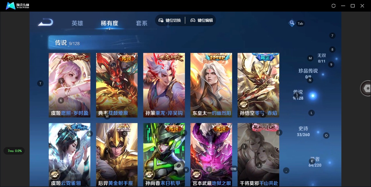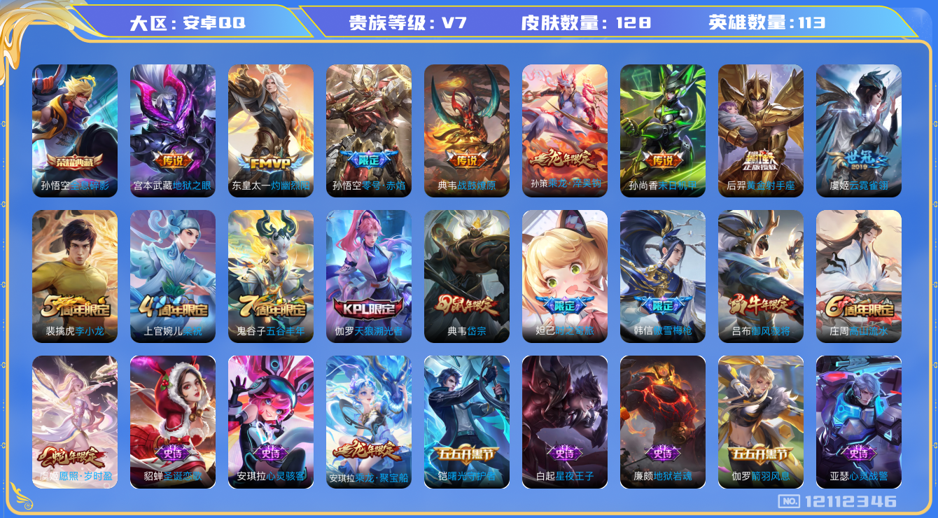 [12112346]V7 1典藏 9传说 113英雄 128皮肤 可修改实名 优质装备:全息碎影(猴子典藏),黄金射手座,云霓雀翎,末日机甲-孙尚香(绿蚂蚱),零号·赤焰,地狱之眼,灼幽烈阳 传说皮:乘龙·淬吴钩(孙策年限),典韦战鼓燎原 珍宝阁皮:蔷薇恋人 限定皮:愿照·岁时盈(虞姬年限),傲雪梅枪,高山流水,五谷丰年,梁祝,御风骁将(吕布年限),岱宗(典韦年限),天狼溯光者,李小龙,时之奇旅-妲己 史诗皮:乘龙·聚宝船(安琪拉年限),电玩小子(小书包),特工魅影,冰冠公主,乱世虎臣,女仆咖啡,水果甜心,星夜王子,心灵骇客,心灵战警,地狱岩魂,繁星吟游(呼啦呼啦),逐浪之夏,曙光守护者,箭羽风息,圣诞恋歌,鹰眼统帅,魅力维加斯