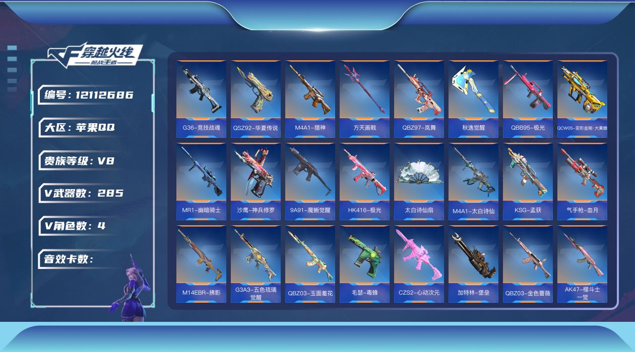 [12112686]V8 20王者武器 285英雄武器 4英雄角色 可二次 可修改实名 优质装备:81式-瑜,王者幻神,MK47-仁德,M4A1-仲达,M4A1-游骑兵,王者之势,王者之影,M200-幻神,CZ75-策,CZS2-仲康,AN94-盖 v武器:G36-竞技战魂,QSZ92-华夏传说,M4A1-猎神,方天画戟,QBZ97-岚舞,秋逸觉醒,QBB95-极光,QCW05-变形金刚·大黄蜂,MR1-幽暗骑士,沙鹰-神兵修罗,9A91-魔蜥觉醒,HK416-极光,太白诗仙扇,M4A1-太白诗仙,KSG-孟获,气手枪-血月,M14EBR-拂影,G3A3-五色琉璃觉醒,QBZ03-玉面羞花,毛瑟-毒蜂,CZS2-心动次元,加特林-堡垒,QBZ03-金色蔷薇,AK47-樱斗士-一觉,QBZ03-死神,GLOCK18-宙斯,柯尔特-伏刹山海觉醒,M4A1-堕天神,丛林匕首-火力竞放觉醒,柯尔特-仲达,手斧-机械迷城,穷奇铁扇,唐刀-大唐荣耀,雷霆权杖-宙斯,丛林匕首-庆龙觉醒,左轮-黑武士,USP-机械迷城,CBJ-MS-毒蜂,电锯-毒蜂,甩棍-卧龙觉醒,G3A3-衍神兵,M14EBR-葫芦山庄,QBZ97-浩瀚征途,巴雷特-朱雀,双持沙鹰-元让,左轮-卧龙觉醒,掠夺者P365-虹舞,M4A1-青龙,破邪蛇棍觉醒,GLOCK18-猎神,马来剑-耀金伯爵,清刚-觉醒,龙爪手-鼓龙,QSZ92-冰魂觉醒,AWM-大湾溢彩,环刃-炫光掠影觉醒,FAMAS-湮灭,MAC-10-孟获,烈焰弓,HK417-炎龙铠甲,VSK-94-金蚀,M4A1-夏清,唐刀-华夏传说,百战巾帼枪,蟒蛇-奉先,M4A1-夏清觉醒,M4A1-千变,9A91-天神,AN94-赳赳秦师,蝴蝶刀-天神,VSK-94-九黎兵主觉醒,M4A1-铁胆虎魄,QBB95-再战涿鹿,M16-恶魔,铁锹-超新星,女皇利刃-铁胆虎魄,CZ75-龙映钟山觉醒,沙鹰-宇航兔兔,气勇胆烈戟,沙鹰-超新星,AN94-精卫填海,XM8-湮灭,AWM-指南针觉醒,AK47-火麒麟,AK47-无影,AK47-麒麟,M4A1-黑龙,M4A1-死神,AK47-黑武士觉醒,M4A1-玫瑰精灵,AK12-天启,巴雷特-坦克堡垒,MG36-黑骑士,刘易斯-血月,加特林-蟒蛇,AWM-天龙,巴雷特-毁灭,巴雷特-极光,暗杀神,巴雷特-枪娘,09式狙-天神,巴雷特-金色蔷