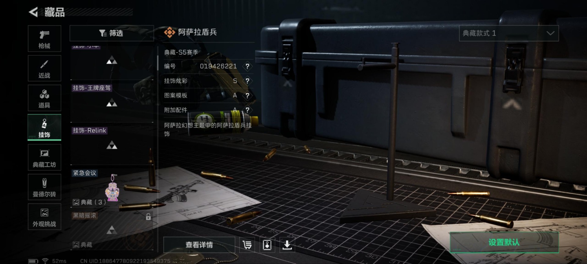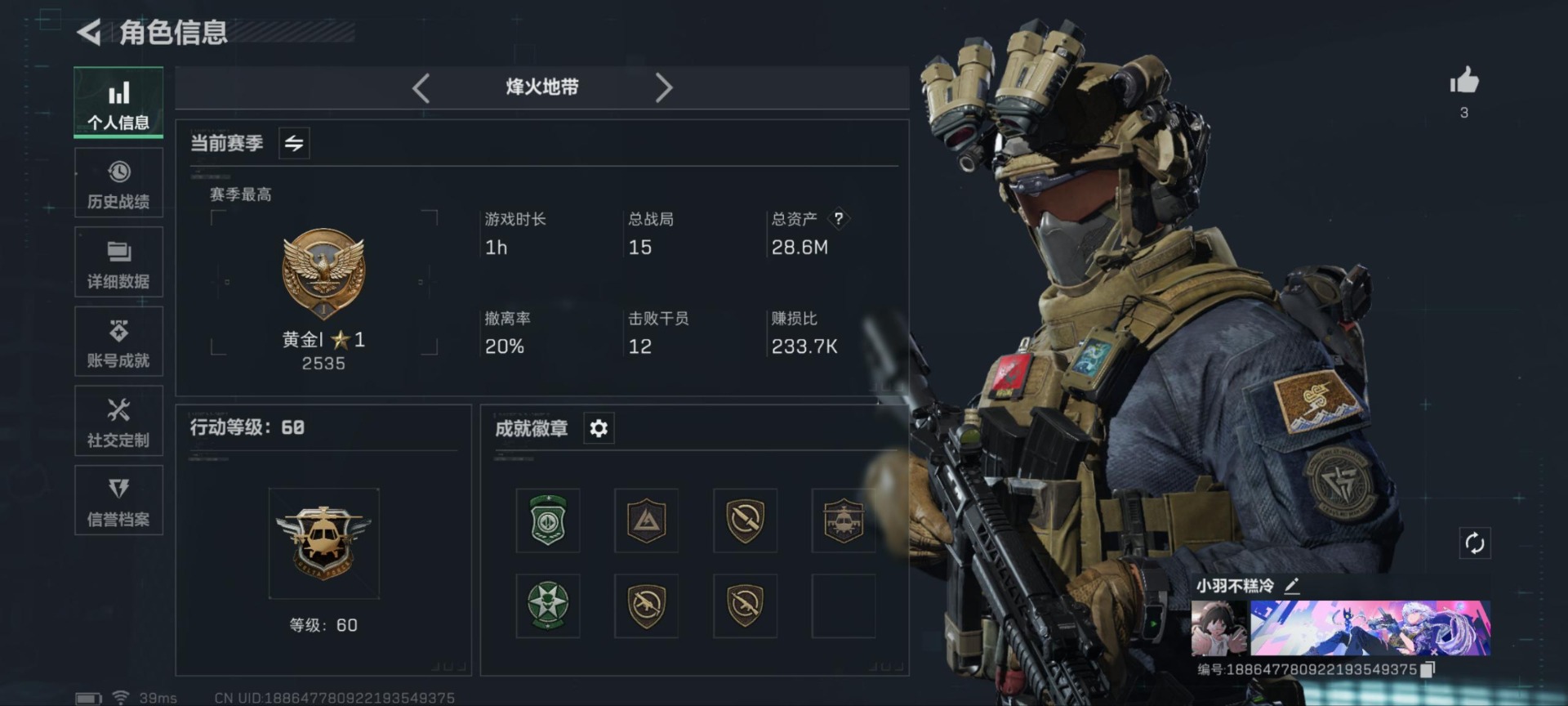 - [12258171]总资产:158.2M 1干员外观 11传说枪械 哈夫币:100 高级安全箱(2×3)9.15号到期 可二次 可修改实名 烽火地带段位:铂金 全面战场段位:无段位 传说武器皮肤:UZI冲锋枪-特斯拉线圈,AWM狙击步枪-捞点薯条,腾龙突击步枪-捞点薯条,93R-捞点薯条,AK-12突击步枪-特斯拉线圈,SR-3M紧凑突击步枪-特斯拉线圈,勇士冲锋枪-能天使-午夜邮差,复合弓-黑-天际线,725双管霰弹枪-送葬人-无题密令,M4A1突击步枪-阿米娅,CAR-15突击步枪-阿米娅 史诗武器皮肤:QJB201轻机枪-Old Habits,M16A4突击步枪-竞赛选手,M250通用机枪-囚徒,AS Val突击步枪-典狱官,SCAR-H战斗步枪-囚徒,腾龙突击步枪-无垢,MP7冲锋枪-无垢,PSG-1射手步枪-无垢,SVD狙击步枪-荒野求生,SR-3M紧凑突击步枪-荒野求生,PKM通用机枪-荒野求生,沙漠之鹰-曙光,SVD狙击步枪-阿萨拉工艺,P90冲锋枪-紧急戒备 干员外观:蜂医-送葬人·无题密令(S5)