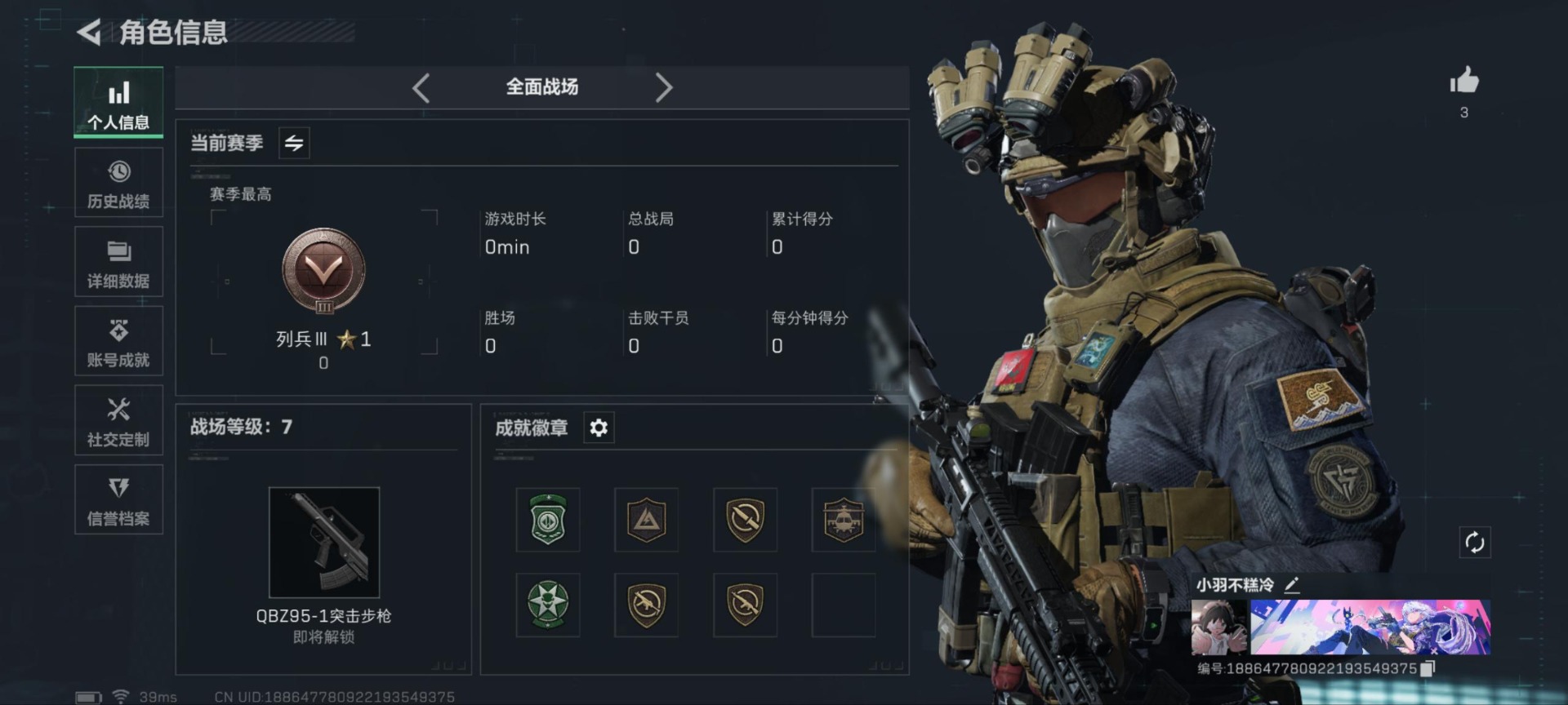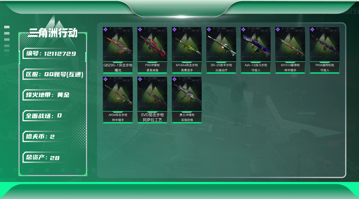 [12112729]总资产:28.6M 哈夫币:2.845K 可二次 可修改实名 烽火地带段位:黄金 全面战场段位:无段位 史诗武器皮肤:M1014霰弹枪-林中猎手,P90冲锋枪-紧急戒备,M16A4突击步枪-竞赛选手,PKM通用机枪-守夜人,QBZ95-1突击步枪-曙光,SVD狙击步枪-阿萨拉工艺,Ash-12战斗步枪-守夜人,SR-25射手步枪-尖端治疗,勇士冲锋枪-深海恐惧,AKM突击步枪-林中猎手