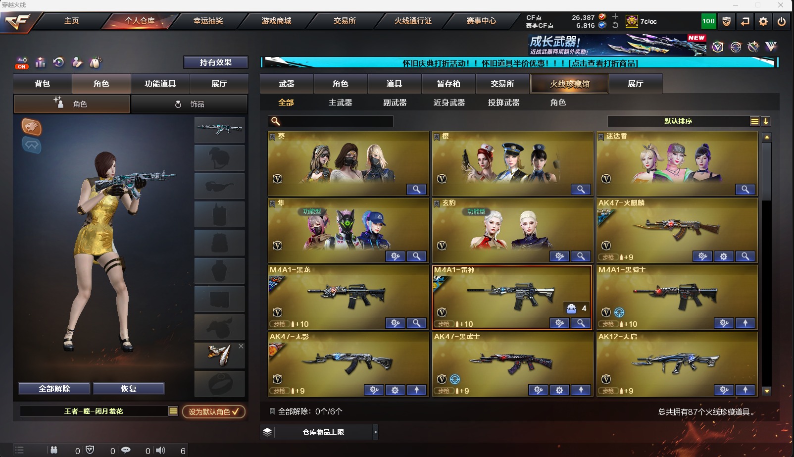 - [11603952]2传说角色 1炫金武器 55V武器 可二次 可修改实名 优质装备:M200-幻神,QBZ03-金色蔷薇,AK47-火麒麟,AK47-机械迷城,M4A1-雷神,M4A1-黑骑士,M4A1-黑龙,M4A1-青龙,M4A1-龙血,M4A1-千变,Barrett-毁灭,Barrett-极光,AWM-天龙,加特林-炼狱,沙鹰-修罗,屠龙,龙啸,麒麟刺,M4A1-幻灵,幻灵之锋,龙啸-烈火龙威,烈火-动感闪耀,天神-动感闪耀,屠龙-动感闪耀,擎天-云海游龙,AK47-黑武士-锦绣游龙,烈龙-云海游龙,无影-神兵利器,COP 357-幻灵,龙啸-云海游龙 排位资格:有 V武器:AK47-黑鲨 王者武器:QBZ-03-王者蔷薇-觉醒版,王者之势-觉醒版,王者之烈-觉醒版 炫金武器:炫金毁灭 热门武器:牛牛-AK47,斯泰尔-枪娘暗刃