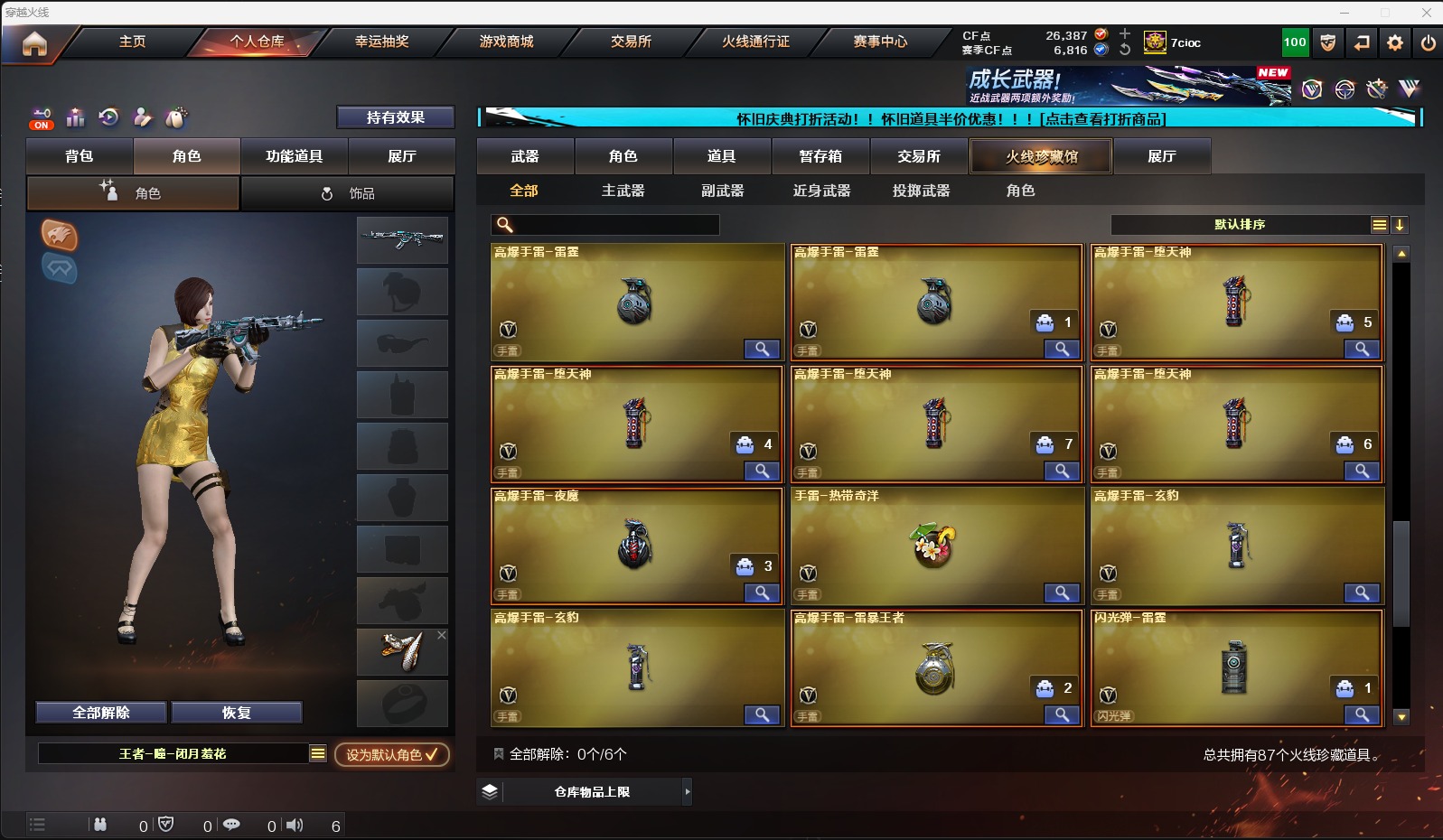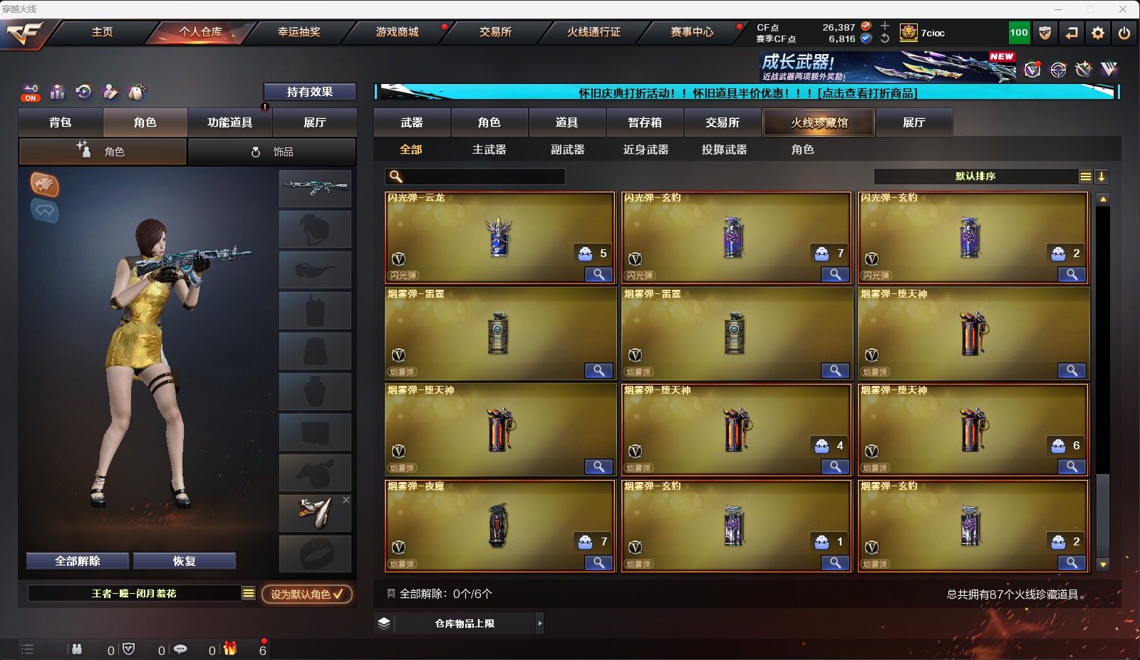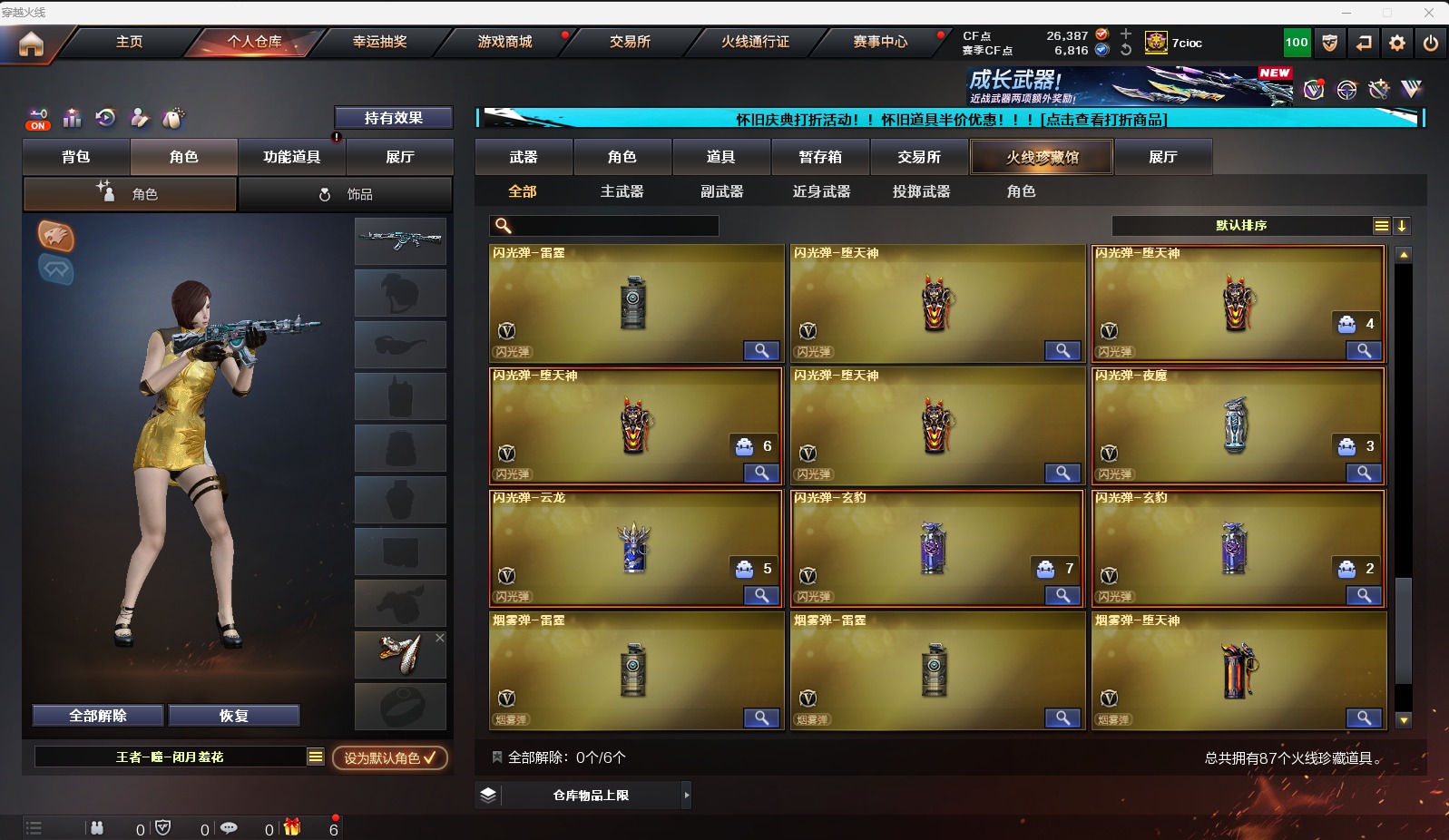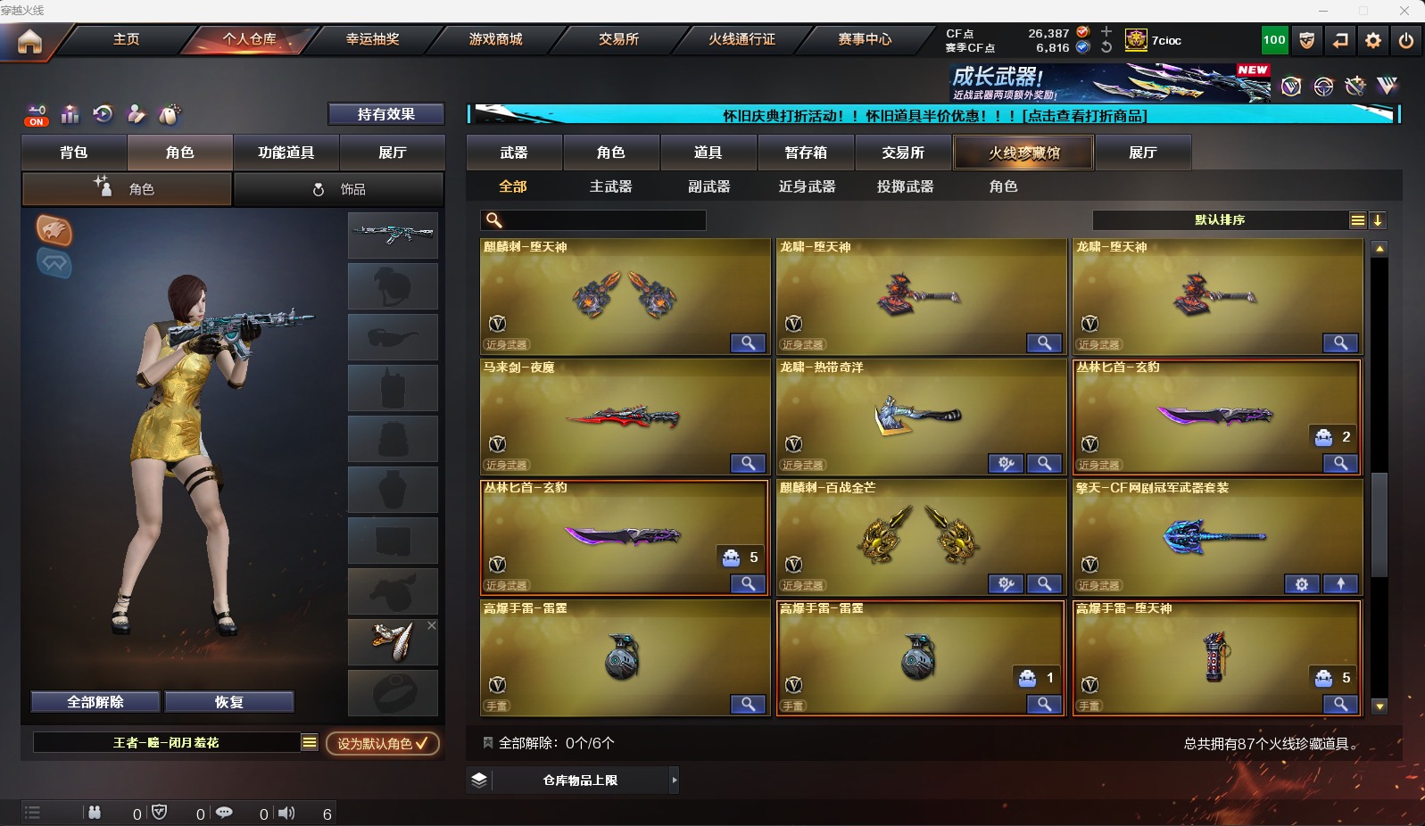 [12112745]可二次 可修改实名 排位资格:有 7王者武器 3炫金武器 79V武器 5V角色 30皮肤 可排位 武器:AWM-裁决,AK12-天启,天神-CF网剧冠军,王者之心,炼狱-百战金芒,QBZ03-金色蔷薇,M4A1-猎神,黑武士-锦绣游龙,Barrett-暗月传说,王者之灵,炫金毁灭,龙啸,炫金骑士,高爆手雷-玄豹,闪光弹-堕天神,USP-冥王,闪光弹-雷霆,M4A1-黑龙,USP-雷暴王者,烟雾弹-夜魔,Barrett-毁灭,黑武士-CF网剧冠军,擎天-CF网剧冠军,死亡之眼,玫瑰精灵-悦动,烟雾弹-玄豹,闪光弹-云龙,M4A1-黑骑士,M4A1-青龙,丛林匕首-玄豹,AWM-天龙,雷霆之锋,加特林-炼狱,马来剑-夜魔,高爆手雷-夜魔,M4A1-再燃火线,汤姆逊-烈龙,Barrett-极光,擎天,麒麟刺-百战金芒,炫金武士,AK47-无影,高爆手雷-雷霆,高爆手雷-雷暴王者,王者之幻,AK47-B-战神,高爆手雷-堕天神,烟雾弹-雷霆,烟雾弹-堕天神,死神-雪域霜狐,麒麟刺-堕天神,AK47-黑武士,王者之幻-觉醒版,机械迷城-穹宇,AK-47-猩红传说,龙啸-堕天神,屠龙,M4A1-雷神,AK47-B-战士,Kar98K-星神,轻型军用手斧-再燃火线,Scar Light-白虎,AK47-火麒麟,闪光弹-玄豹,王者之影,M200-幻神,HK417-朱雀,闪光弹-夜魔,AN94-超新星,王者之魄-觉醒版,沙鹰-修罗,王者之力-觉醒版