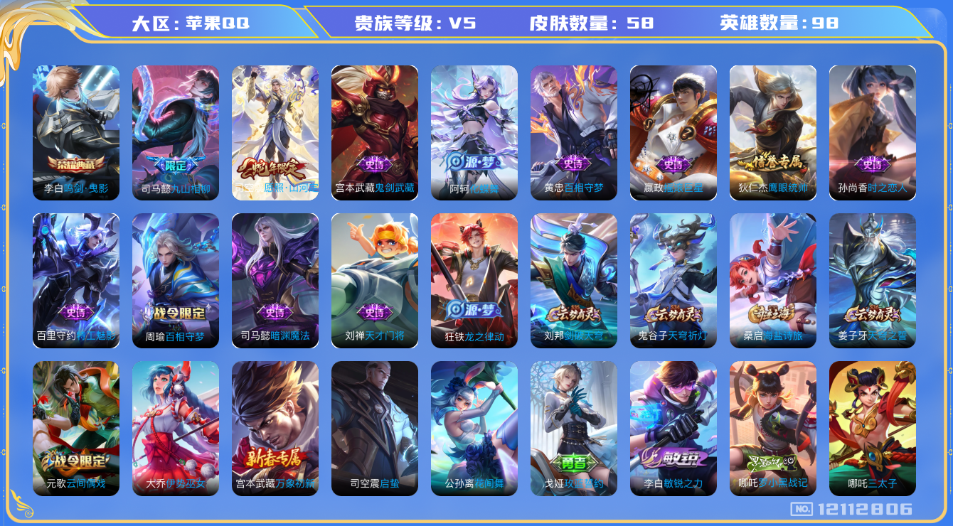 - [11519862]V7 12传说 123英雄 255皮肤 可修改实名 优质装备:黄金狮子座,零号·赤焰,李逍遥,无双飞将,山海·炽霜斩(李信年限),浮生妄 传说皮:乘龙·淬吴钩(孙策年限),幻光神枪 珍宝阁皮:妄想食味,蔷薇恋人,女武神 限定皮:愿照·九州拓(澜年限),鸣野蒿,至尊宝,诗剑行,五谷丰年,武圣,游园惊梦,御风骁将(吕布年限),默契交锋-花木兰,匿光追影者,寅虎·御盾(廉颇年限) 史诗皮:鸭鸭历险记-刘禅,星界战将,龙之律动,石田雨龙,东方月初,蒙犽顽岩魄,埋骨钱,百相守梦-黄忠,苍穹之光,电玩小子(小书包),黄金分割率,特工魅影,千年之狐,电玩·爆裂旋风,江河有灵,百解令(蒙犽),高渐离燃音魔法,蒙恬荣光圣徽,偶像歌手,无限星赏官,晚萤,猫狗日记-孙策,时之恋人-孙尚香,乱世虎臣,节奏热浪,修罗,女仆咖啡,摇滚巨星,水果甜心,绅士熊喵,天才门将,星夜王子,功夫厨神,德古拉伯爵,暗隐猎兽者,幽灵船长,鬼剑武藏,天秀·启明,舞动绿茵,地狱岩魂,纤云弄巧,拒霜思,乘风破浪,逐浪之夏,水晶猎龙者,曙光守护者,箭羽风息,金属风暴,原初追逐者,圣诞恋歌,鹰眼统帅,魅力维加斯,黎明之约,赏金猎手,寅虎·御盾,未来纪元-赵云