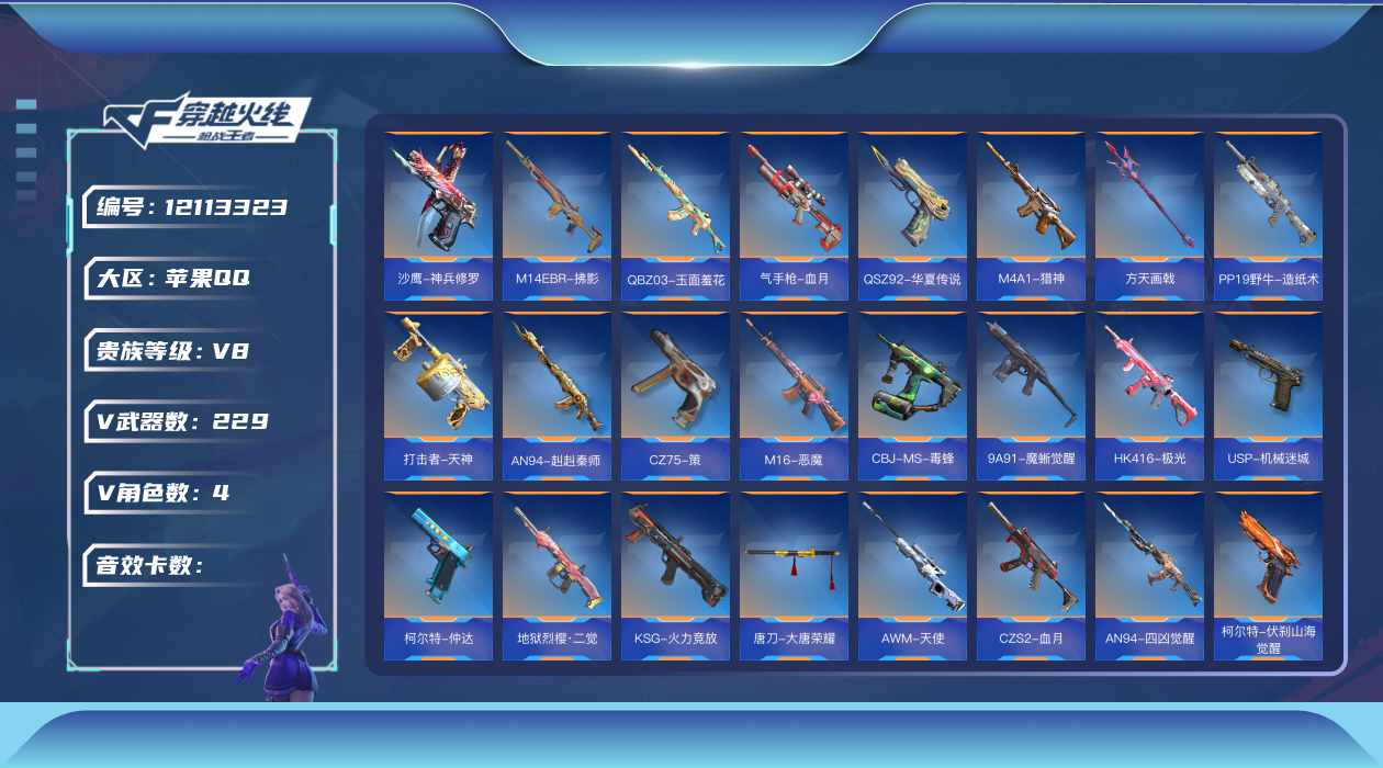[12113323]可二次 可修改实名 V8 16王者武器 229英雄武器 4英雄角色 440万化 专家 武器:王者之圣,王者之魄,王者之心,王者之翼,王者之烈,王者之蝶,M4A1-仲达,激昂霸王枪,MK47-云舞,81式-光明之神,CZ75-策,王者之魂,巴雷特-极光,巴雷特-毁灭,M4A1-死神,M4A1-黑骑士,AK47-木兰,M4A1-雷神,AK47-无影,AK47-火麒麟,AWM-游骑兵,AWM-天使,QBZ03-金色蔷薇,AUG-机械纪元,QBZ03-死神,QBZ19-天使,双持斯泰尔-天使,亡命之徒-幻兽,M4A1-猎神,M4A1-龙血,M4A1-赛博雷神,M4A1-夏清觉醒,M4A1-千变,M4A1-海骑士,AK47-黑鲨,M4A1-玫瑰精灵,M4A1-樱龙·一觉,M4A1-Rush-夜袭,AK47-沙漠郡主-超觉,AK47-猩红传说,AK47-沙漠领主,AWM-天龙,AWM-裁决,剑齿虎-炫彩,AN94-四凶觉醒,M14EBR-天神,9A91-天神,CBJ-MS-毒蜂,打击者-天神,CZS2-血月,斯泰尔-蝴蝶,PP19野牛-造纸术,地狱烈樱·二觉,AA12-火药,KSG-火力竞放,地狱火,地狱烈炎,M14EBR-拂影,QBZ03-玉面羞花,MK47-鼓龙,AK47-破空冰刃,9A91-魔蜥觉醒,AN94-赳赳秦师,HK416-极光,MK23-幻神,柯尔特-仲达,蟒蛇-奉先,方天画戟,沙鹰-修罗,USP-机械迷城,沙鹰-火麒麟,M16-恶魔,COP 357-雷霆王者,MK23-机械纪元,QSZ92-天使,双持柯尔特-极光,QSZ92-华夏传说,CZ75-龙映钟山觉醒,气手枪-血月,沙鹰-神兵修罗,马来剑-毁灭,百战巾帼枪,USP-太白诗仙,擎天,擎天觉醒,MK47-塔罗牌觉醒,王者之影烟雾弹,王者之影闪光弹,王者之翼烟雾弹,王者之心烟雾弹,王者之心手雷,王者之势烟雾弹,王者之圣烟雾弹,沙鹰-飞电,柯尔特-伏刹山海觉醒,CZ75-穷奇,唐刀-大唐荣耀,星芒,烟雾弹-天使,烟雾弹-雷暴,高爆手雷-雷霆,黑骑士烟雾弹,黑武士烟雾弹,黑武士闪光弹,黑武士手雷,火麒麟手雷,烟雾弹-游骑兵,燃烧弹-游骑兵,死神烟雾弹,死神闪光弹,死神手雷,雷神手雷,高爆手雷-无限,手雷-云海游龙,高爆手雷-雷霆王者,闪光弹-神工天巧,CZS2-仲康,DDM4-PDW-星际宇航觉醒,鹰爪