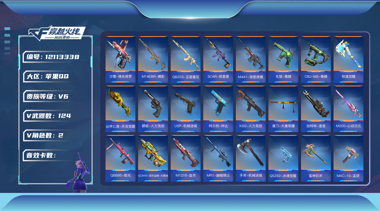 [12113338]可二次 可修改实名 V6 2王者武器 124英雄武器 2英雄角色 272万化 大师SS 武器:MK47-仁德,M200-幻神,SCAR-文远,巴雷特-毁灭,AK47-死神,AK47-雷暴,M4A1-雷神,AK47-燎天净火,AK47-无影,AK47-无影-葵,M4A1-黑骑士,巴雷特-金色蔷薇,巴雷特-极光,QBZ03-金色蔷薇,AUG-机械纪元,QBB95-极光,双持斯泰尔-天使,AK47-沙漠郡主-超觉,AK47-亚龙,AK47-心动次元觉醒,AK47-血武士,AK47-华夏传说,M4A1-赛博雷神,M4A1-心动次元觉醒,M4A1-海骑士,AWM-裁决,AWM-天龙,AK12-天启,SCAR-探星者,M200-心动次元觉醒,98K-血月,M200-心动次元,MR1-幽暗骑士,QBZ03-玉面羞花,CBJ-MS-毒蜂,地狱火,QCW05-变形金刚·大黄蜂,汤姆逊-烈龙,加特林-蟒蛇,CZS2-心动次元觉醒,KSG-火力竞放,寒霜烈龙,M1216-血月,AK47-破空冰刃,M14EBR-拂影,加特林-堡垒,RPK-盘龙,RPK-赤炎盘龙,柯尔特-仲达,铁锹-孟德,双持柯尔特-极光,沙鹰-修罗,毛瑟-毒蜂,沙鹰-宇航兔兔,USP-雷暴,沙鹰-神兵修罗,USP-机械迷城,M4A1-铁胆虎魄,手斧-机械迷城,斩神刀-雷暴,擎天觉醒,马来剑-毁灭,尼泊尔-冰锋觉醒,百战巾帼枪,蟒蛇-火力竞放,双持沙鹰-亚龙,神罚战斧,丛林匕首-庆龙觉醒,血阳,龙啸,丛林匕首-火力竞放,唐刀-大唐荣耀,双持尼泊尔-亚龙,麒麟刺,血月,秋逸觉醒,屠龙,女皇利刃-铁胆虎魄,黑骑士手雷,黑骑士闪光弹,黑骑士烟雾弹,燃烧弹-游骑兵,烟雾弹-游骑兵,闪光弹-游骑兵,烟雾弹-匿影遁形,死神烟雾弹,雷神手雷,雷神闪光弹,雷神烟雾弹,高爆手雷-无限,手雷-云海游龙,闪光弹-雷霆王者,烟雾弹-雷霆王者,QBZ97-浩瀚征途,AN94-盖,巴雷特-朱雀,甩棍-卧龙觉醒,卡牌大师-悠悠,左轮-卧龙觉醒,GLOCK18-猎神,双持沙鹰-元让,烟雾弹-星际宇航,G3A3-衍神兵,末日裁决觉醒,HK417-炎龙铠甲,M1887-幽冥玄喵觉醒,MAC-10-孟获,QSZ92-冰魂觉醒,烈焰刀,烈焰弓,蛮神巨斧,手雷-游骑兵,QBZ03-天罚,AWM-大湾溢彩,黑骑士燃烧弹,环刃-炫光掠影觉醒,改装GLOCK-樱龙
