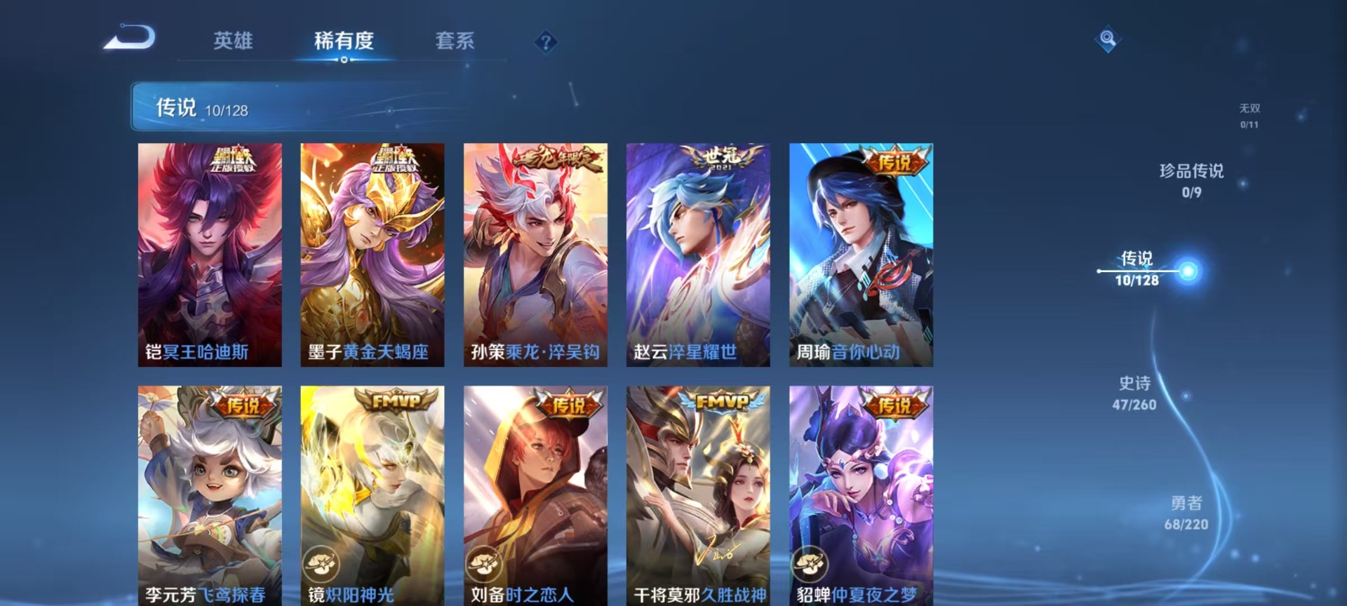 - PX_2095394-98 安卓QQ/尊贵铂金/293皮肤/124英雄/2典藏/0珍品无双/0无双/0珍品传说/10传说/78史诗/8稀有英雄 【2 典藏皮肤】全息碎影 孙悟空,弑枪猎影 韩信, 【10 传说皮肤】碎云 百里守约,飞鸢探春 李元芳,地狱火 孙悟空,云鹰飞将 曜,凤求凰 李白,祈雪灵祝 公孙离,鹤羽星尊 诸葛亮,末日机甲 孙尚香,乘龙·淬吴钩 孙策,愿照·九州拓 澜, 【78 史诗皮