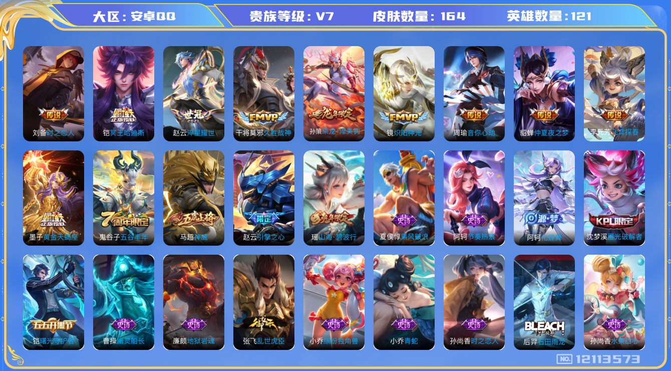 [12113573]V7 10传说 121英雄 164皮肤 可修改实名 优质装备:久胜战神,炽阳神光,仲夏夜之梦(大飞蛾),飞鸢探春,音你心动-周瑜,时之恋人-刘备(电焊工),淬星耀世,黄金天蝎座 传说皮:乘龙·淬吴钩(孙策年限),铠冥王哈迪斯 限定皮:神威(电光马子),山海·碧波行(瑶年限),五谷丰年,引擎之心 史诗皮:化蝶舞,石田雨龙,战舞者,织梦人,特工魅影,千年之狐,冰冠公主,青蛇,蒙恬荣光圣徽,电玩·爆裂旋风,匿光破解者,银翎春语,时之恋人-孙尚香,乱世虎臣,节奏热浪,女仆咖啡,摇滚巨星,水果甜心,星夜王子,心灵骇客,暗隐猎兽者,幽灵船长,鬼剑武藏,心灵战警,舞动绿茵,地狱岩魂,缤纷独角兽,乘风破浪,曙光守护者,唤灵魅影,金属风暴,圣诞狂欢,圣诞恋歌,鹰眼统帅,暗夜贵公子,魅力维加斯,玫瑰异探