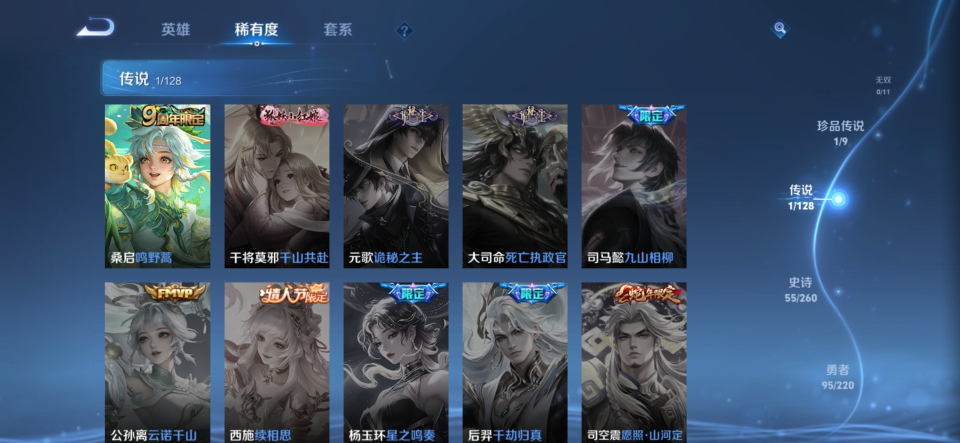 - [11884118]V7 9传说 124英雄 159皮肤 可修改实名 女号 优质装备:黄金射手座,猫影幻舞,久胜战神,地狱火,胖达荣荣,超时空战士-狄仁杰,涂山容容 珍宝阁皮:蔷薇恋人 限定皮:凤求凰(白切鸡),五谷丰年,武圣,天狼狩猎者,祈雪灵祝(雪兔子),李小龙,冰霜恋舞曲,美猴王 史诗皮:紫霞仙子,黄金分割率,特工魅影,千年之狐,魅语,无限星赏官,水果甜心,星夜王子,心灵骇客,幽灵船长,鬼剑武藏,纤云弄巧,逐浪之夏,曙光守护者,金属风暴,原初追逐者,圣诞恋歌,鹰眼统帅,王者之锤,暗夜贵公子,魅力维加斯,黎明之约