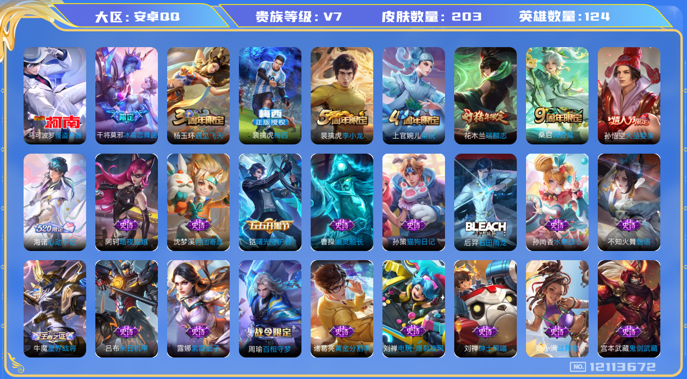 [12113672]V7 1珍品传说 1传说 124英雄 203皮肤 可修改实名 优质装备:怪盗基德,涂山容容 限定皮:鸣野蒿,梅西,瑞麟志(木兰年限),遇见飞天,梁祝,李小龙,大圣娶亲,冰霜恋舞曲 史诗皮:星界战将,龙之律动,石田雨龙,百相守梦-周瑜,破空之剑,战舞者,芈月浮光幕影,海诺心动手记,织梦人,紫霞仙子,黄金分割率,特工魅影,千年之狐,魅语,蒙恬荣光圣徽,冰冠公主,电玩·爆裂旋风,暗夜猫娘,末日机甲-吕布,猫狗日记-孙策,摇滚巨星,水果甜心,绅士熊喵,星夜王子,功夫厨神,幽灵船长,鬼剑武藏,纤云弄巧,逐浪之夏,月团寄思,水晶猎龙者,曙光守护者,金属风暴,原初追逐者,圣诞恋歌,鹰眼统帅,魅力维加斯,黎明之约,未来纪元-赵云