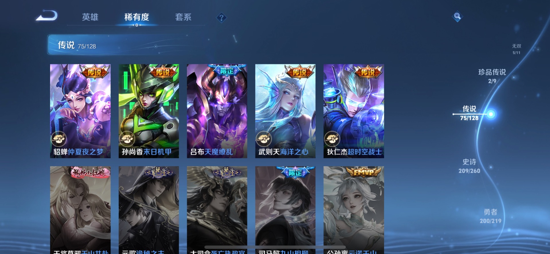 - [11554189]V7 5传说 125英雄 214皮肤 可修改实名 传说皮:乘龙·铭钟鼎(赵云年限),云鹰飞将(小将军),遇见神鼓 珍宝阁皮:妄想食味,蔷薇恋人 限定皮:鸣野蒿,至尊宝,神威(电光马子),飞衡(韩信年限),诗剑行,五谷丰年,梁祝,天狼征服者,李小龙 史诗皮:鸭鸭历险记-刘禅,龙之律动,琥珀纪元伽罗,百相守梦-周瑜,苍穹之光,黄金分割率,永昼,江河有灵,冰冠公主,龙骑士(小龙虾),末日机甲-吕布,猫狗日记-孙策,乱世虎臣,节奏热浪,摇滚巨星,水果甜心,绅士熊喵,天才门将,星夜王子,心灵骇客,暗隐猎兽者,幽灵船长,天秀·启明,舞动绿茵,地狱岩魂,纤云弄巧,繁星吟游(呼啦呼啦),缤纷独角兽,乘风破浪,逐浪之夏,水晶猎龙者,曙光守护者,圣诞狂欢,圣诞恋歌,鹰眼统帅,暗夜贵公子,魅力维加斯,无心,未来纪元-赵云