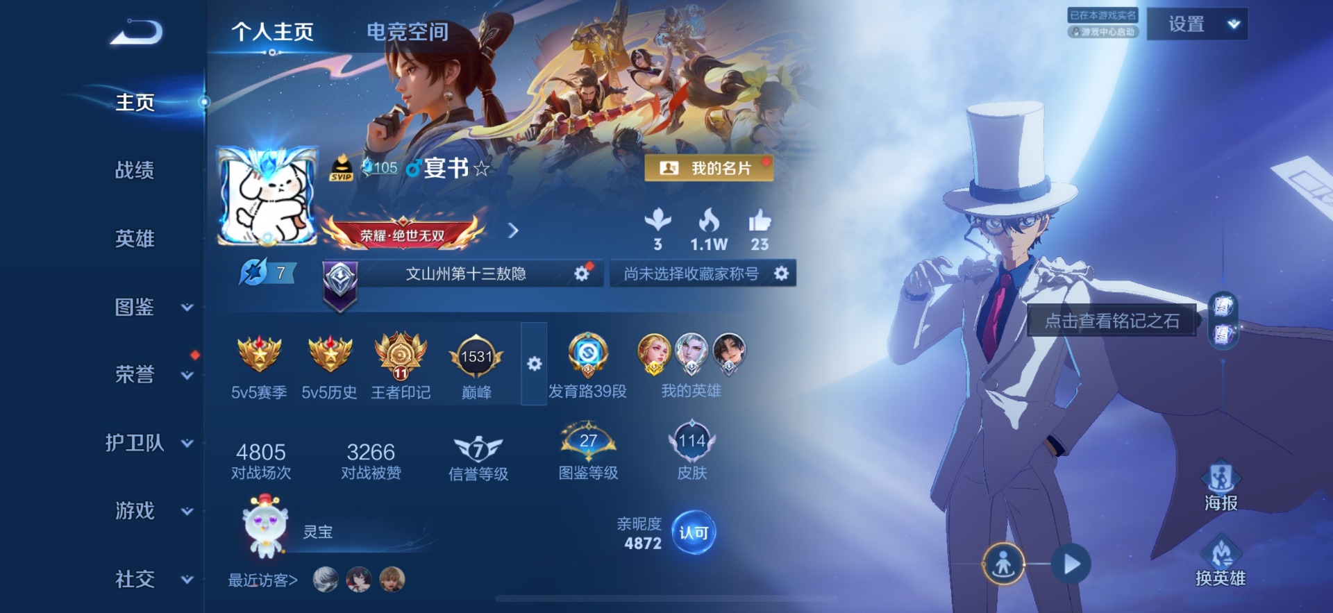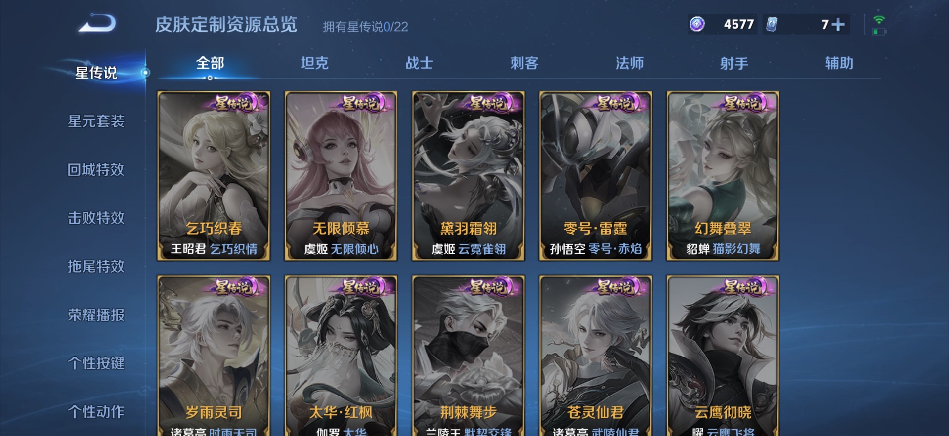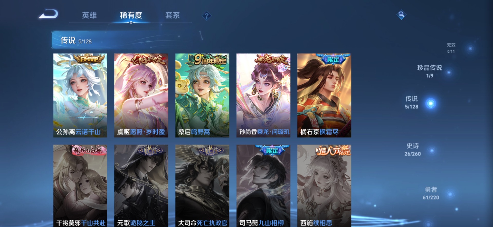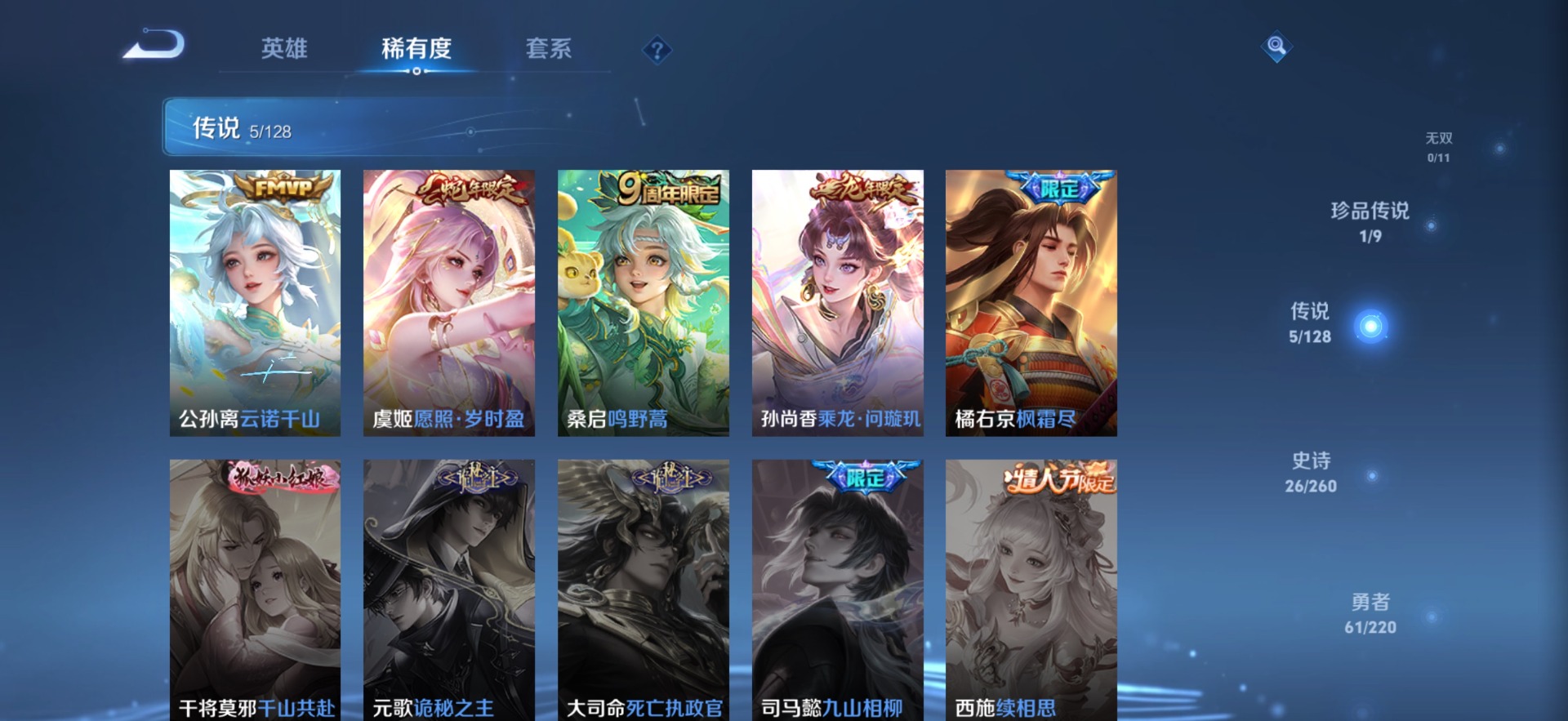 - PX_2054271-贵族等级: V7 英雄数: 117 皮肤数: 160 荣耀水晶: 神鉴启示录 无双皮: 雪境奇遇-甄姬 传说皮: 浮生妄,幻光神枪 限定皮: 李小龙,游园惊梦,梁祝,至尊宝,高山流水,孙行者,傲雪梅枪,五谷丰年,降魔,愿照·众生和,愿照·山河定,愿照·岁时盈