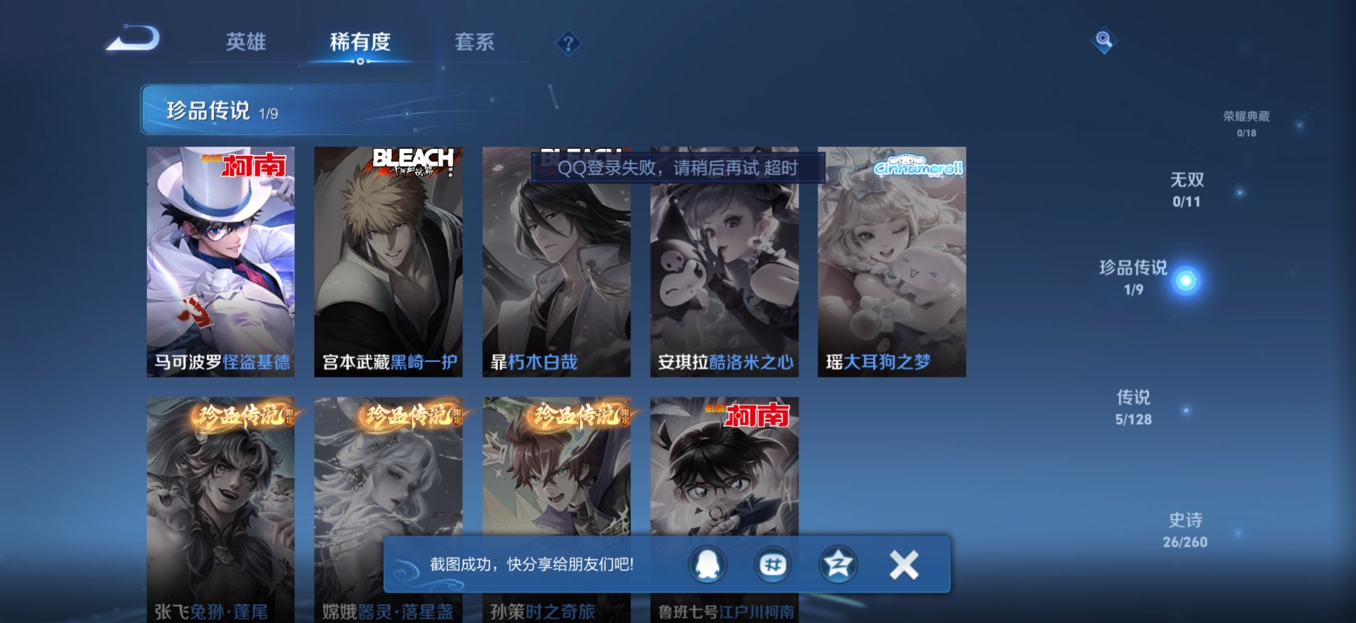 - [11597794]V6 1珍品传说 5传说 123英雄 200皮肤 可修改实名 优质装备:怪盗基德,一念神魔,末日机甲-孙尚香(绿蚂蚱),乞巧织情,挚爱之约 珍宝阁皮:玩趣恶龙 限定皮:鸣野蒿,傲雪梅枪,遇见飞天,高山流水,游园惊梦,梁祝,李小龙,纯白花嫁,大圣娶亲 史诗皮:星界战将,龙之律动,石田雨龙,百相守梦-黄忠,紫霞仙子,黄金分割率,特工魅影,永昼,江河有灵,蒙恬荣光圣徽,偶像歌手,电玩·爆裂旋风,末日机甲-吕布,猫狗日记-孙策,乱世虎臣,节奏热浪,女仆咖啡,摇滚巨星,水果甜心,天才门将,星夜王子,功夫厨神,德古拉伯爵,暗隐猎兽者,鬼剑武藏,心灵战警,舞动绿茵,缤纷独角兽,乘风破浪,逐浪之夏,箭羽风息,金属风暴,原初追逐者,圣诞狂欢,圣诞恋歌,鹰眼统帅,暗夜贵公子,黎明之约,未来纪元-赵云