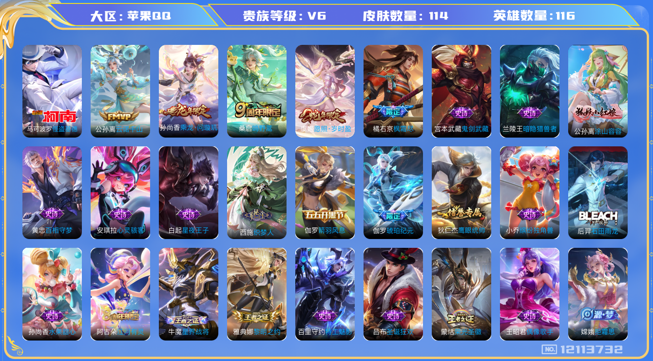 [12113732]V6 1珍品传说 5传说 116英雄 114皮肤 可修改实名 优质装备:怪盗基德,涂山容容 传说皮:乘龙·问璇玑(孙尚香年限),云诺千山 限定皮:愿照·岁时盈(虞姬年限),鸣野蒿,枫霜尽 史诗皮:星界战将,石田雨龙,琥珀纪元伽罗,百相守梦-黄忠,织梦人,特工魅影,江河有灵,蒙恬荣光圣徽,偶像歌手,水果甜心,星夜王子,心灵骇客,暗隐猎兽者,鬼剑武藏,拒霜思,缤纷独角兽,箭羽风息,圣诞狂欢,鹰眼统帅,黎明之约