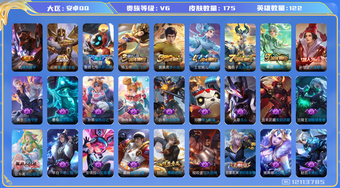 [12113785]V6 3传说 122英雄 175皮肤 可修改实名 优质装备:黄金射手座,绛天战甲(鸡嘴战神),涂山容容 珍宝阁皮:胡桃夹子,蔷薇恋人 限定皮:鸣野蒿,遇见飞天,五谷丰年,梁祝,李小龙,大圣娶亲,乒乒小将 史诗皮:龙之律动,百相守梦-黄忠,白龙吟,特工魅影,千年之狐,冰冠公主,龙骑士(小龙虾),末日机甲-吕布,猫狗日记-孙策,摇滚巨星,水果甜心,绅士熊喵,心灵骇客,功夫厨神,暗隐猎兽者,幽灵船长,鬼剑武藏,纤云弄巧,拒霜思,金属风暴,原初追逐者,鹰眼统帅,魅力维加斯,无心,未来纪元-赵云