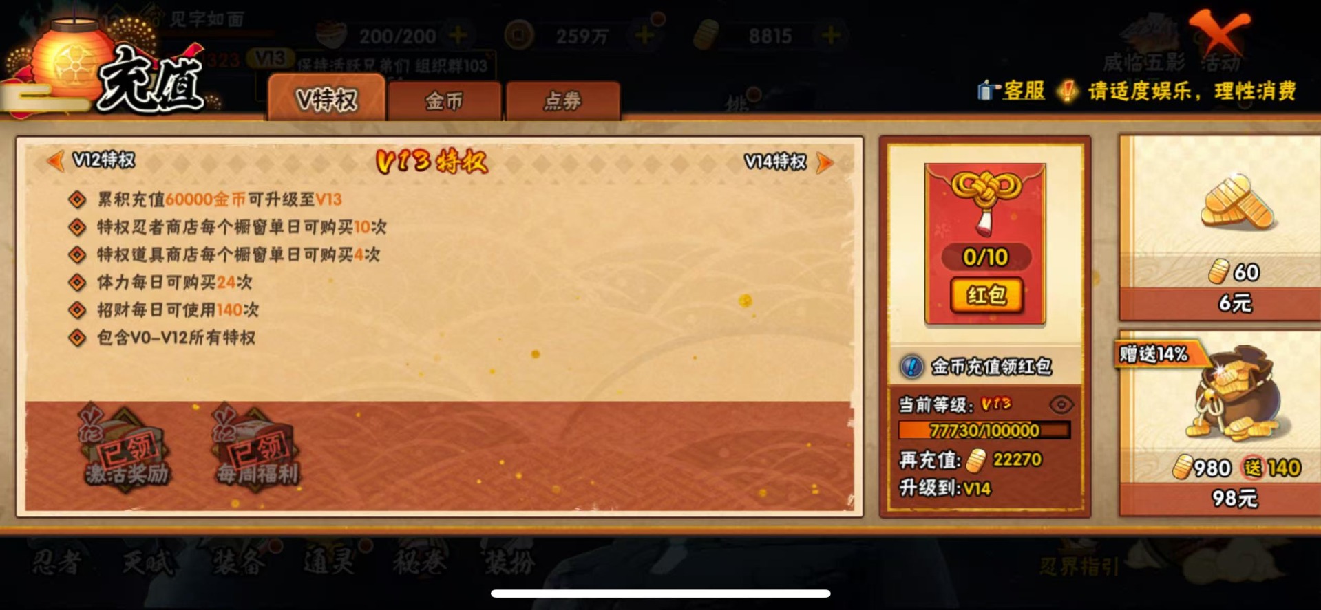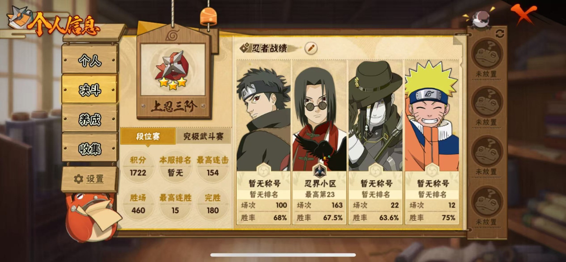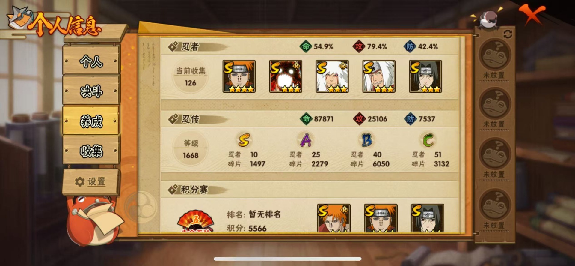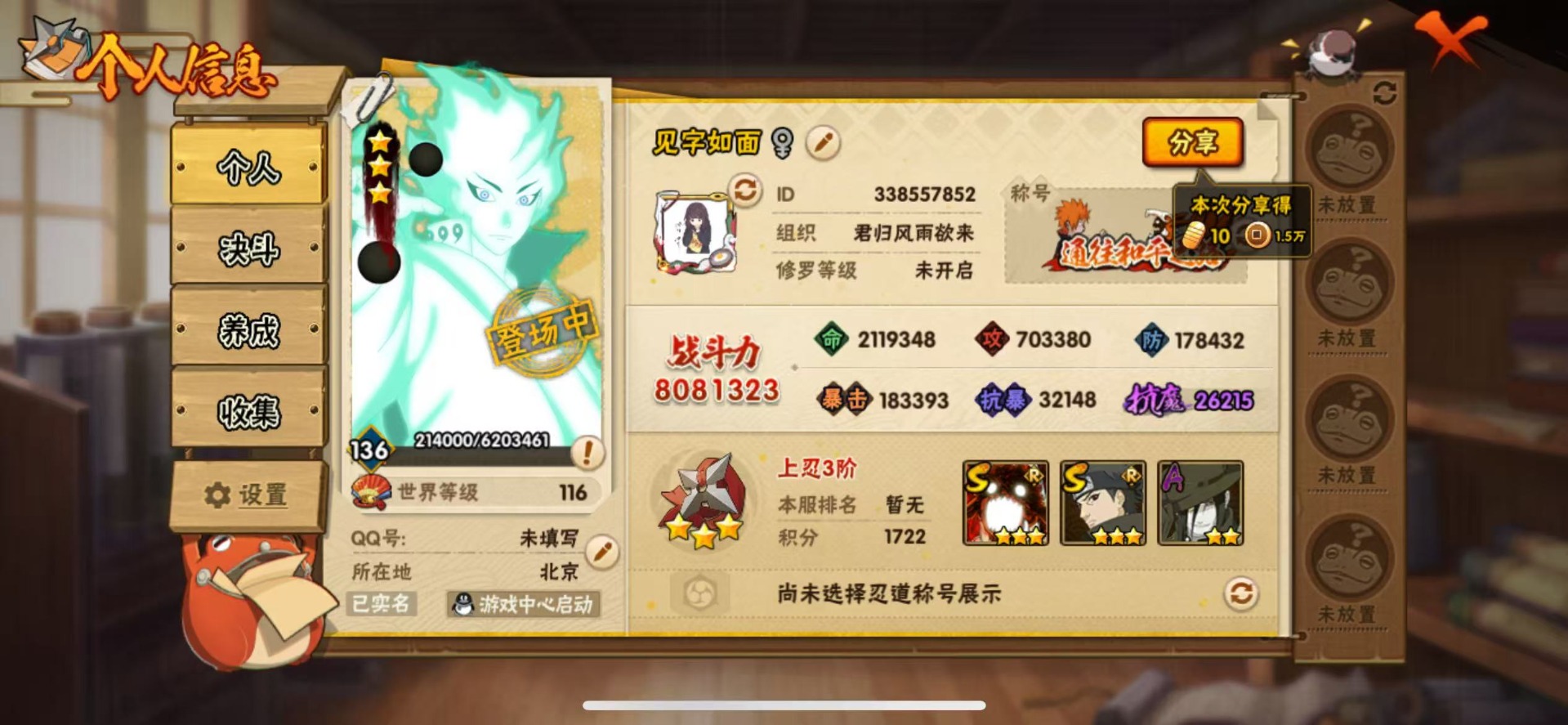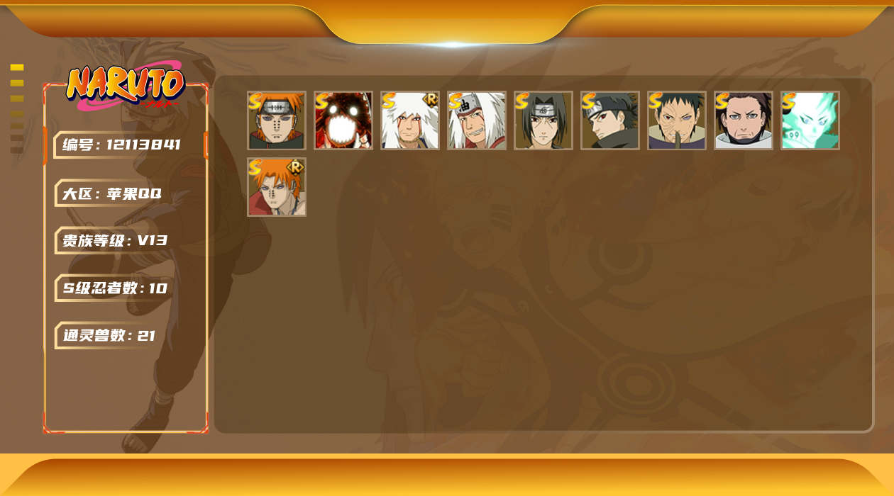 [12113841]V13 10S忍 25A忍 21通灵 808.1W战力 可二次 可修改实名 优质装备:熊猫,佩恩·天道「超」,宇智波带土 「忍界大战」,宇智波止水「须佐能乎」,大筒木舍人 「最终章」,自来也 「传说中的三忍」,漩涡鸣人 「暴怒·第六尾」,烈斗「初代目风影」 S级忍者:自来也 「舞之豪杰」,宇智波鼬 「须佐能乎」,佩恩「天道」